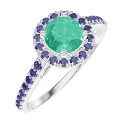 « L'ATELIER » Nº170912Anillo Oro blanco 9 quilates - Esmeralda redondo 0.5 quilates - Halo Zafiro azul - Engastado Zafiro azul 5