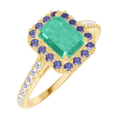 Anillo Oro amarillo 18 quilates - Esmeralda Rectángulo 0.5 quilates - Halo Zafiro azul - Engastado Diamante