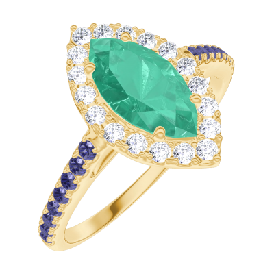 « L'ATELIER » Nº171117Anillo Oro amarillo 18 quilates - Esmeralda Marquesa 0.5 quilates - Halo Diamante - Engastado Zafiro azul