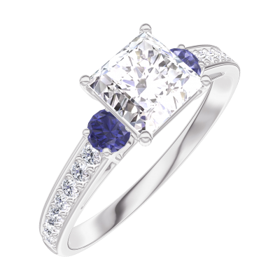 « L'ATELIER » N.º 184968Anillo Oro blanco 9 quilates - Diamante de laboratorio Princesa 0.7 quilates - Piedras laterales Zafiro azul - Engastado Diamante de laboratorio