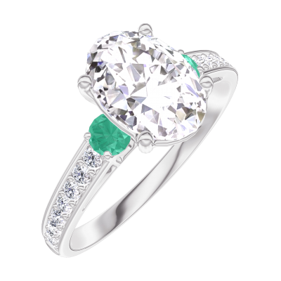« L'ATELIER » Nº187588Anillo Oro blanco 9 quilates - Diamante de laboratorio Ovalo 1 quilates - Piedras laterales Esmeralda - Engastado Diamante de laboratorio 4.8