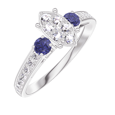 « L'ATELIER » Nº210768Anillo Oro blanco 9 quilates - Conjunto de diamantes naturales Marquesa equivalente 0.7 - Piedras laterales Zafiro azul - Engastado Diamante