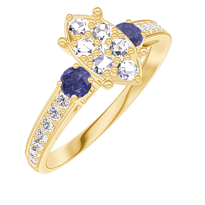 « L'ATELIER » Nº211366Anillo Oro amarillo 9 quilates - Conjunto de diamantes naturales Marquesa equivalente 1 - Piedras laterales Zafiro azul - Engastado Diamante