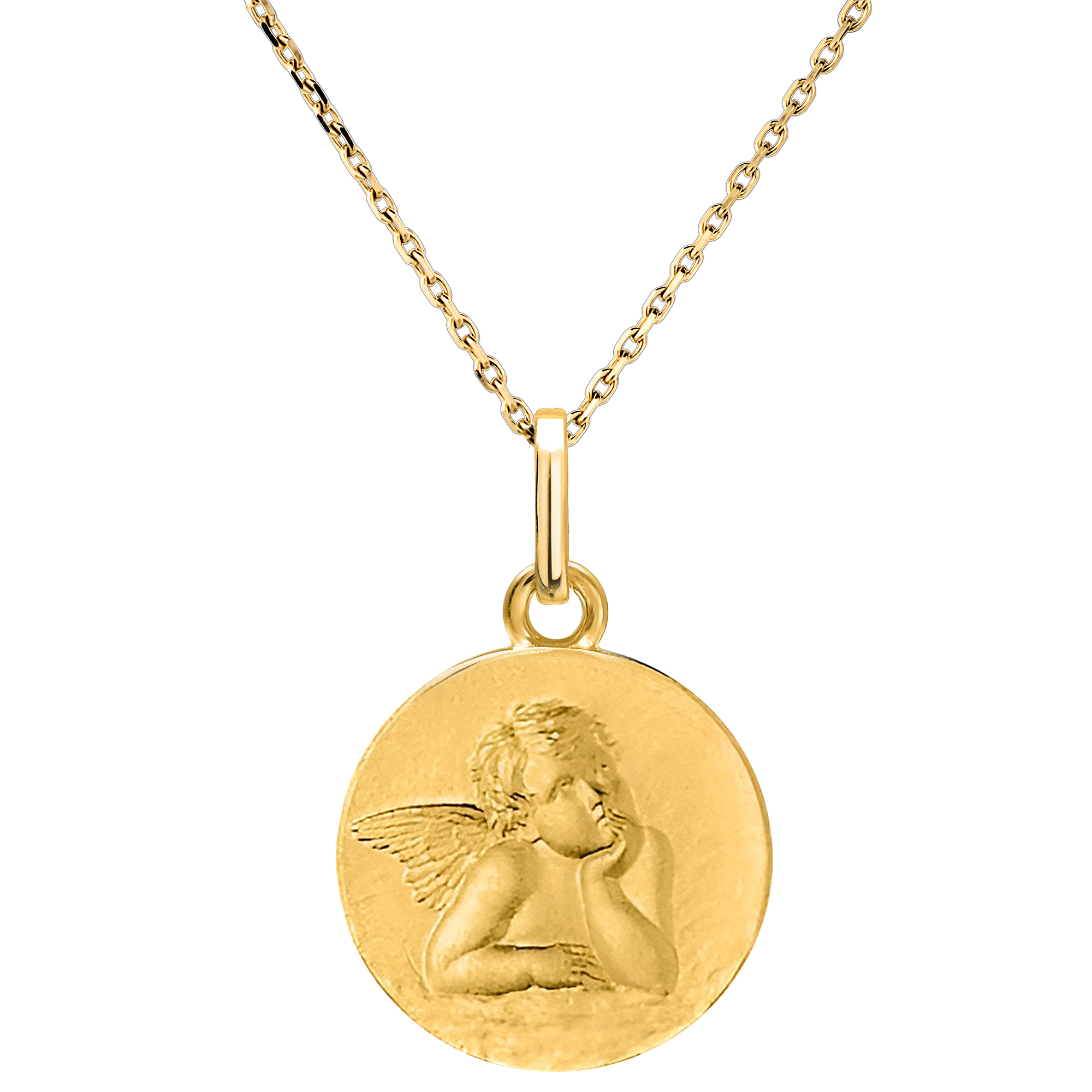 Esta medalla de oro amarillo representa a un ángel en un dulce sueño, encarnando la pureza, serenidad y contemplación. Una joya simbólica, perfecta para celebrar un bautizo o nacimiento, evocando la inocencia divina y el vínculo espiritual entre el cielo y la tierra.