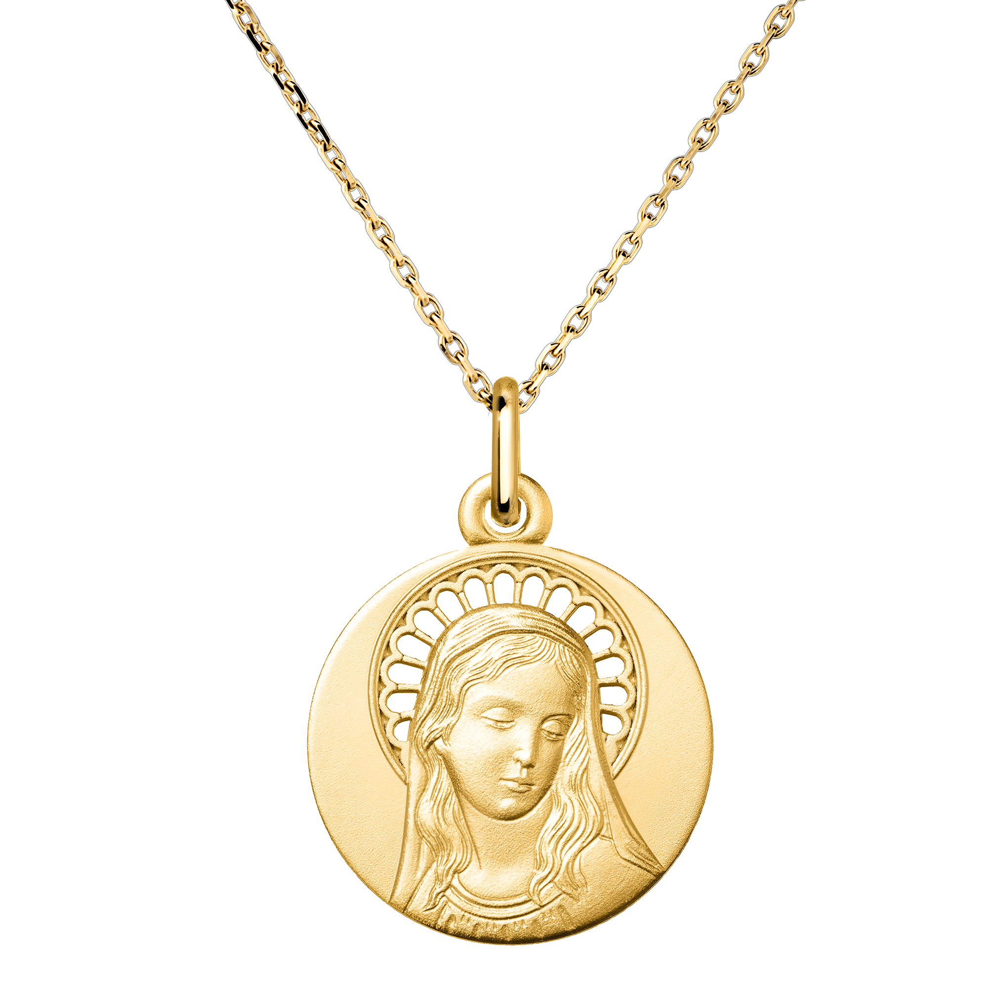 La medalla mide 16 mm de diámetro y pesa aproximadamente 1,8 g, un tamaño elegante y discreto para una joya religiosa.