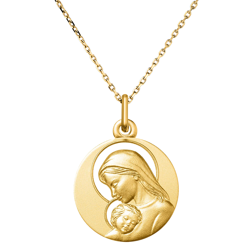 Esta medalla de oro amarillo ilustra un momento de ternura entre la Virgen María y el Niño Jesús. Las aureolas caladas que rodean sus rostros aportan ligereza y luminosidad a esta delicada escena. La simplicidad de los detalles resalta la pureza del vínculo maternal y la protección divina. Una pieza significativa, ideal para celebrar un bautizo o comunión.