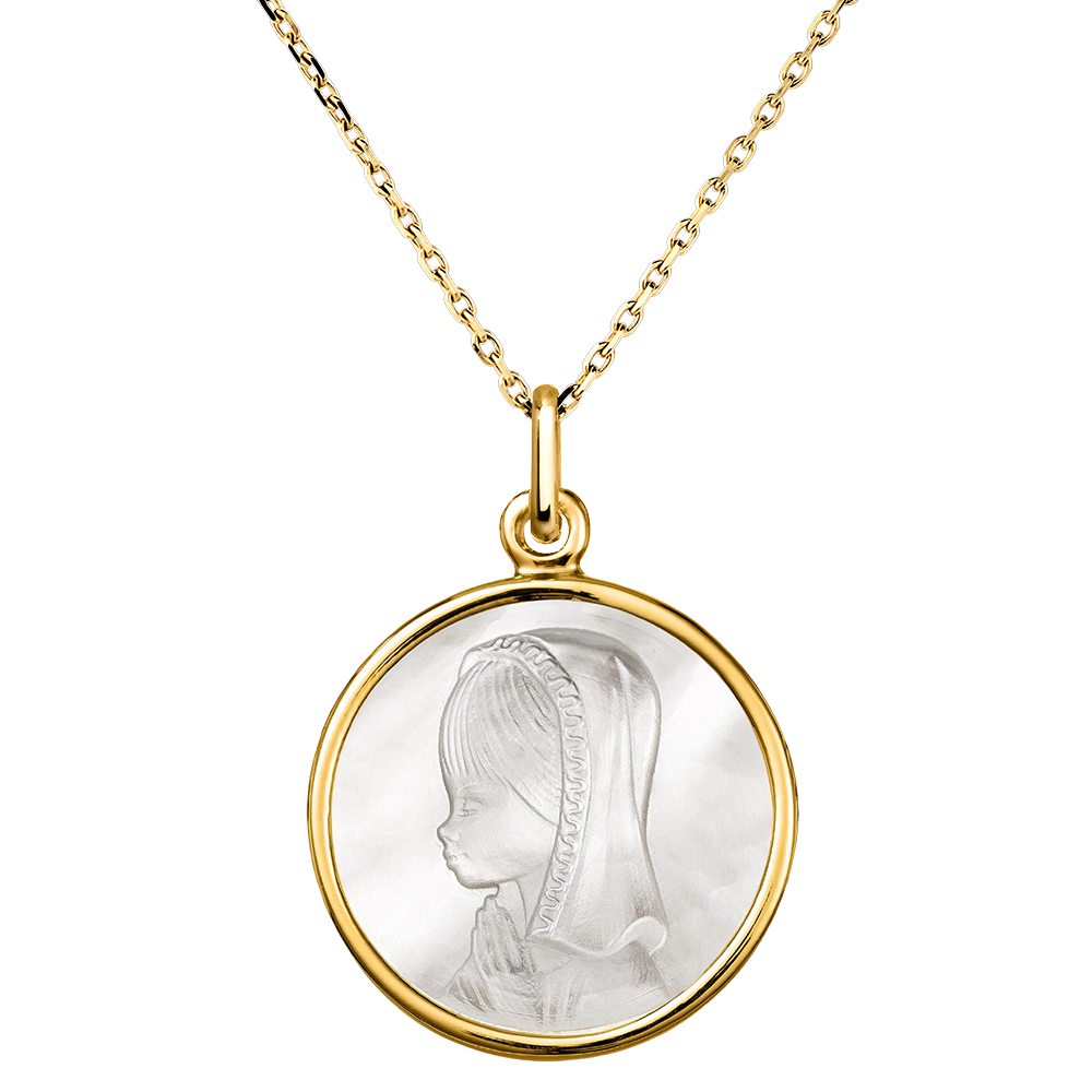Esta medalla de oro amarillo y nácar muestra un delicado perfil de la Virgen María, con las manos unidas en oración. El nácar aporta una luminosidad suave y pura a la imagen, mientras que el oro amarillo resalta la serenidad de la escena. Una joya que simboliza la devoción, la pureza y la protección divina, ideal para un bautizo, primera comunión u otra ocasión espiritual.