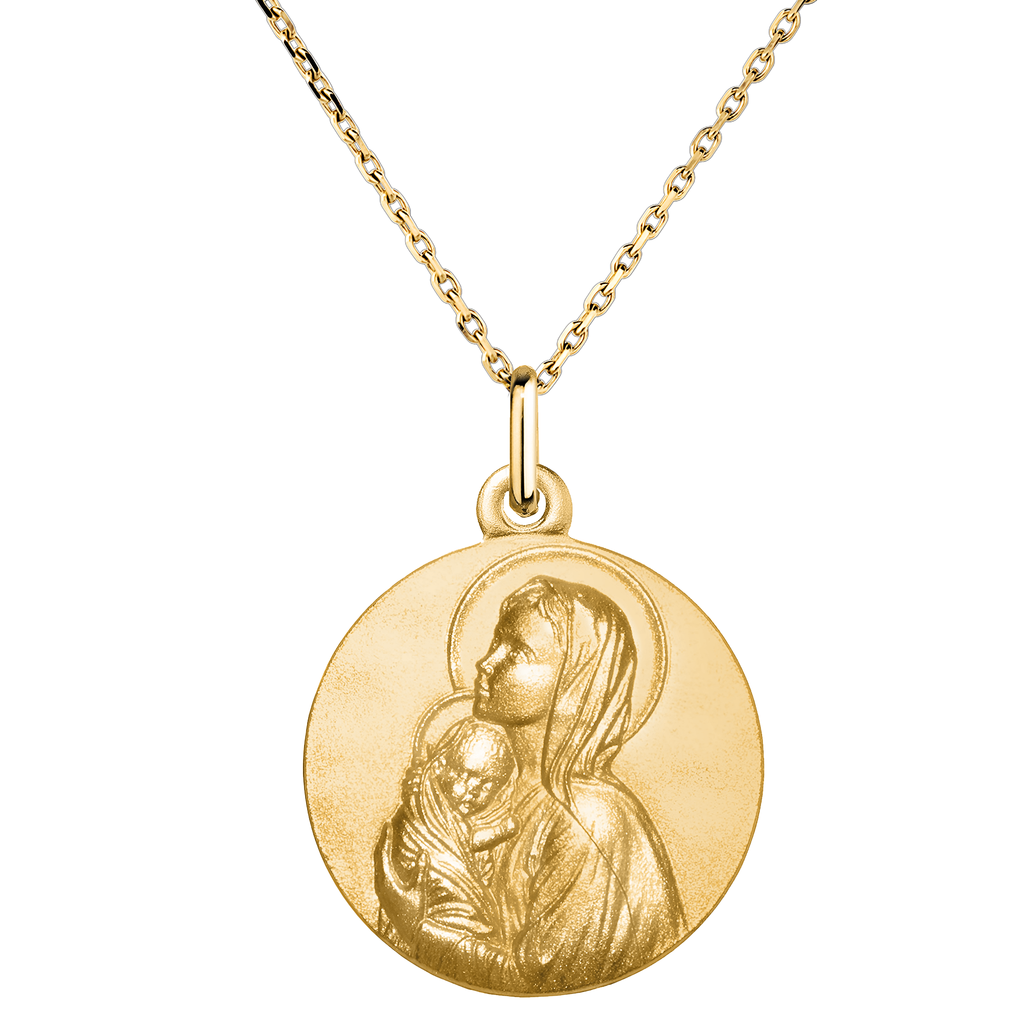 Esta medalla de oro amarillo captura la intimidad y ternura del vínculo entre la Virgen María y el Niño Jesús. Su postura serena y protectora está representada en un magnífico relieve que refleja una profunda suavidad. El brillo del oro amarillo resalta la delicadeza de este momento sagrado, simbolizando el amor maternal y la fe. Esta pieza atemporal es perfecta para marcar una ocasión espiritual, como un bautizo o comunión.
