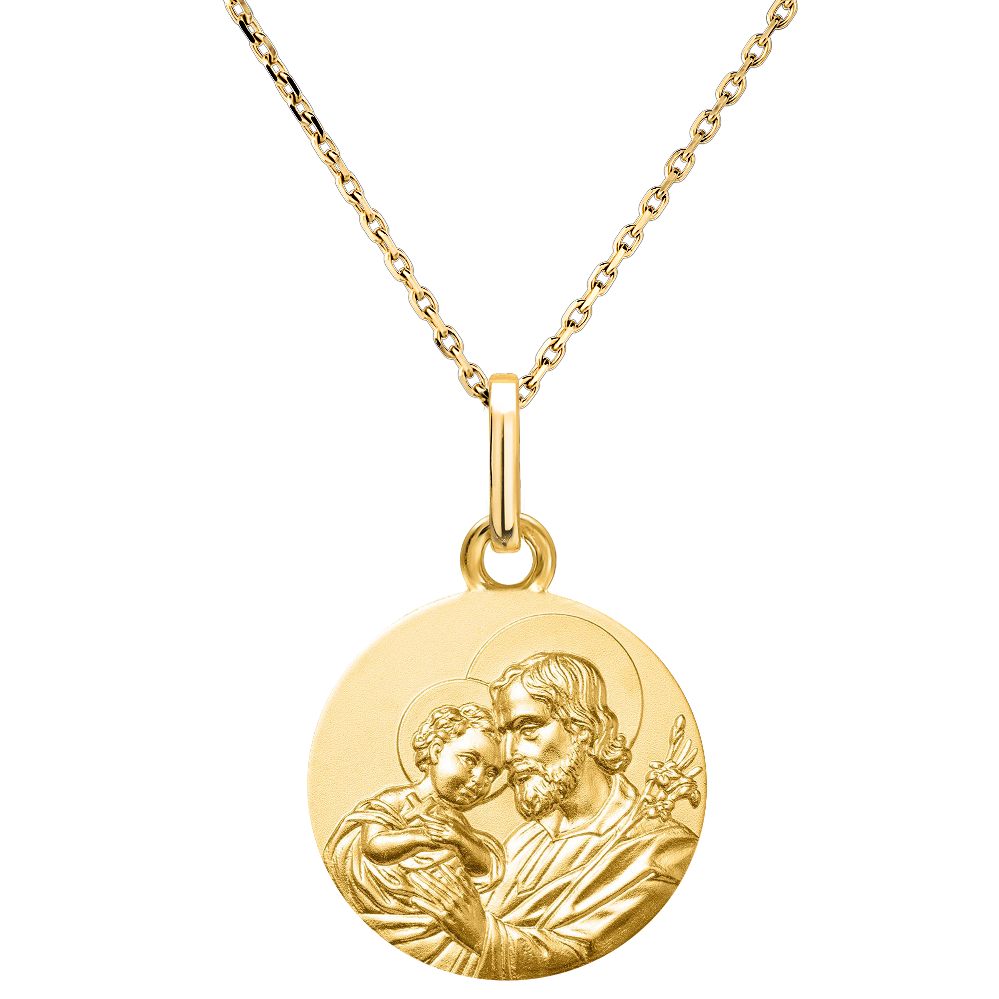 Esta medalla en oro amarillo de 9 quilates representa la tierna escena de San José sosteniendo al Niño Jesús, símbolo de protección divina y amor paternal.