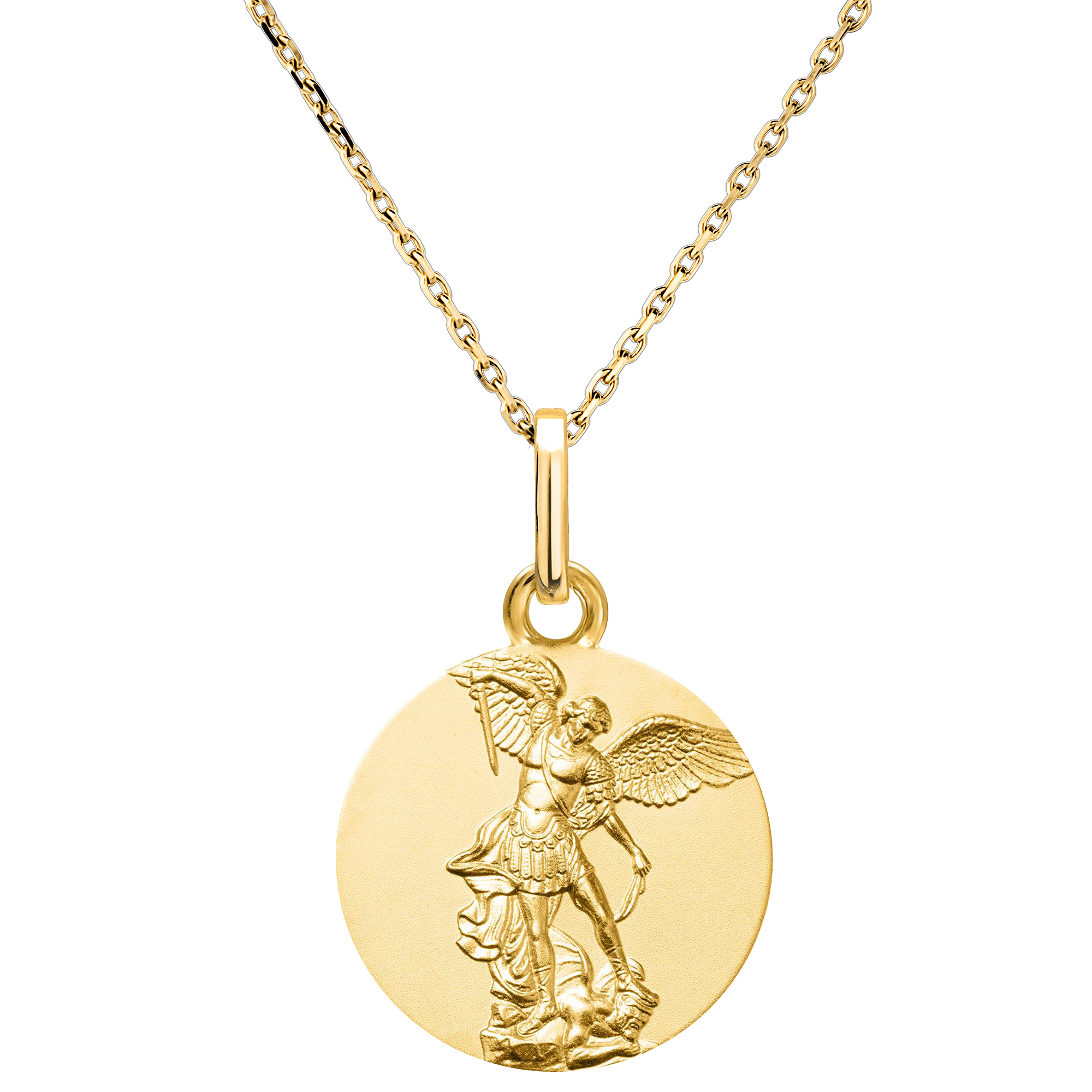 Esta medalla en oro amarillo de 18 quilates representa a San Miguel Arcángel derrotando al demonio, símbolo de protección contra el mal y fuerzas negativas.