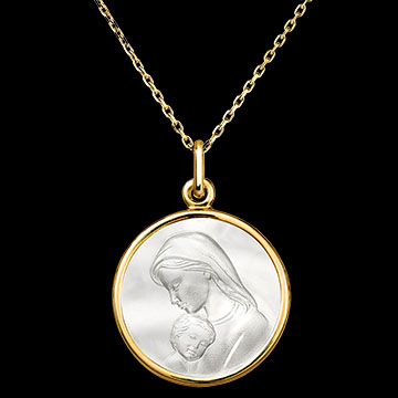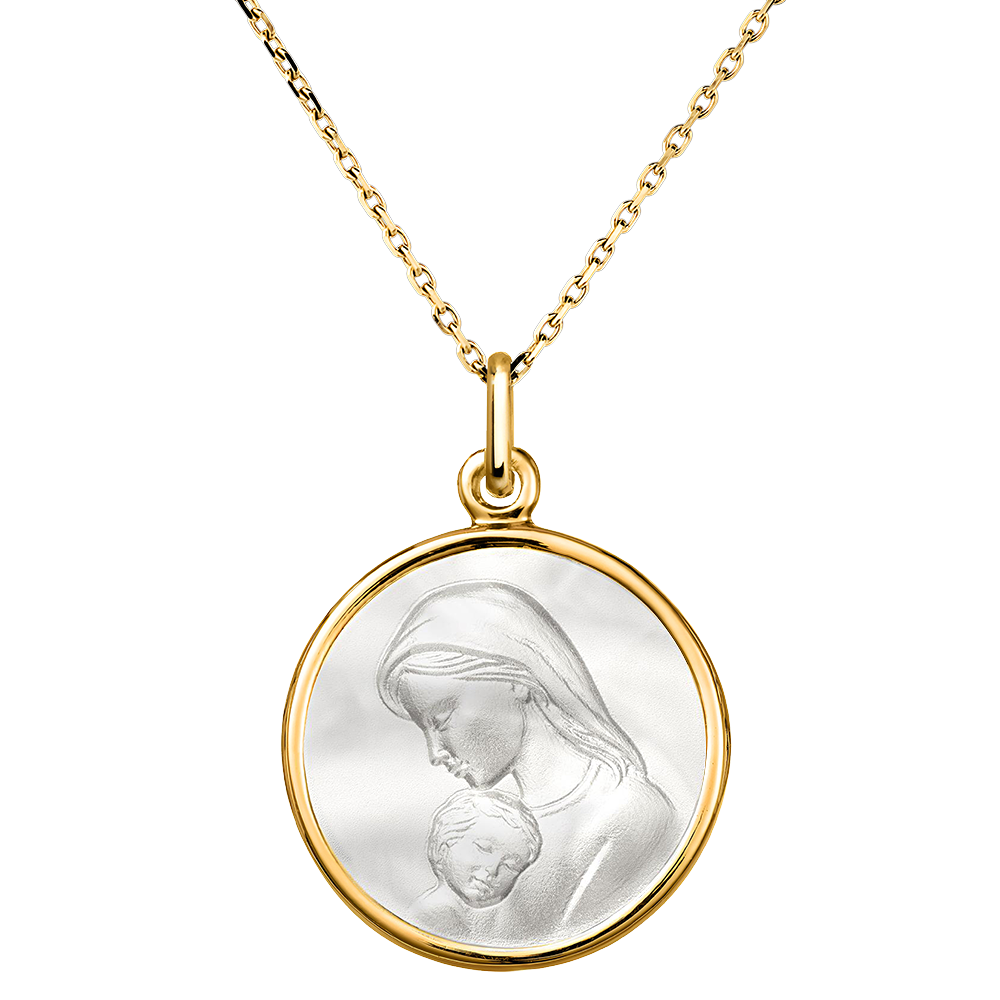 Esta medalla de oro amarillo de 18 quilates y nácar destaca el intercambio íntimo y tierno entre la Virgen María y el Niño Jesús.