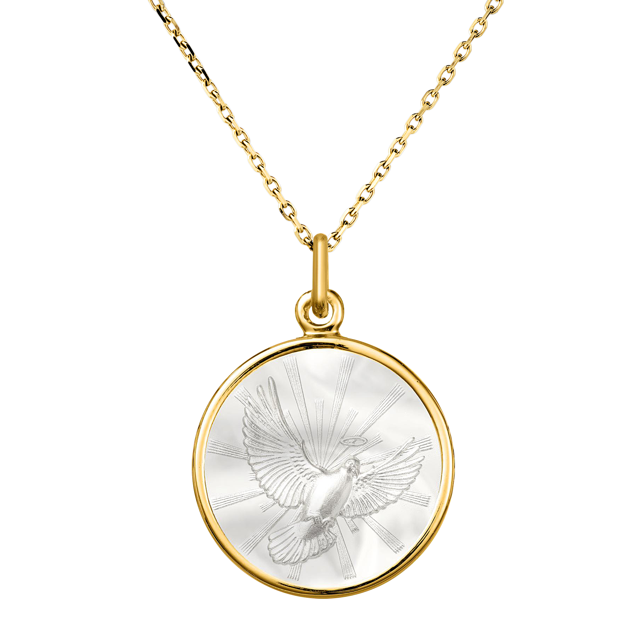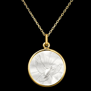 Esta medalla en oro amarillo 18 quilates presenta una paloma en vuelo esculpida en relieve sobre nácar luminoso. Rodeada por un halo y rayos, representa un símbolo universal de paz y armonía.
