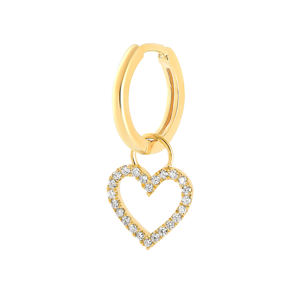 Un pendiente criolla individual en oro amarillo 18 quilates adornado con un dije en forma de corazón pavé con 24 diamantes blancos.
