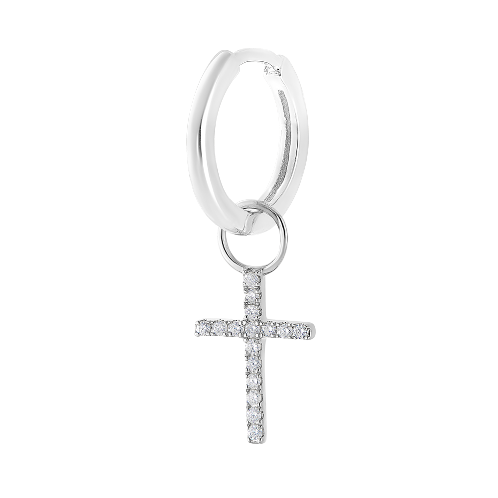 Este pendiente criolla único está elaborado en oro blanco de 9 quilates y decorado con un dije en forma de cruz pavimentado con 16 diamantes brillantes.
