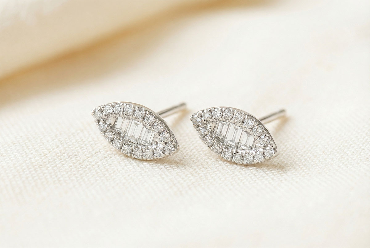 Una trilogía de diamantes estilo baguette, realzados por un recubrimiento fino, dando como resultado un par de pendientes finos y femeninos, inspirados en historias orientales.