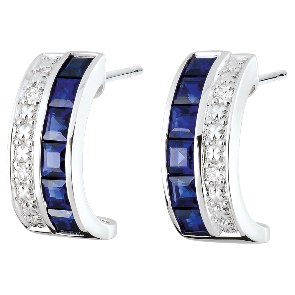 Elegantes pendientes de aro en Oro Blanco con zafiros azules en el centro, sublimados por diamantes y flores de oro