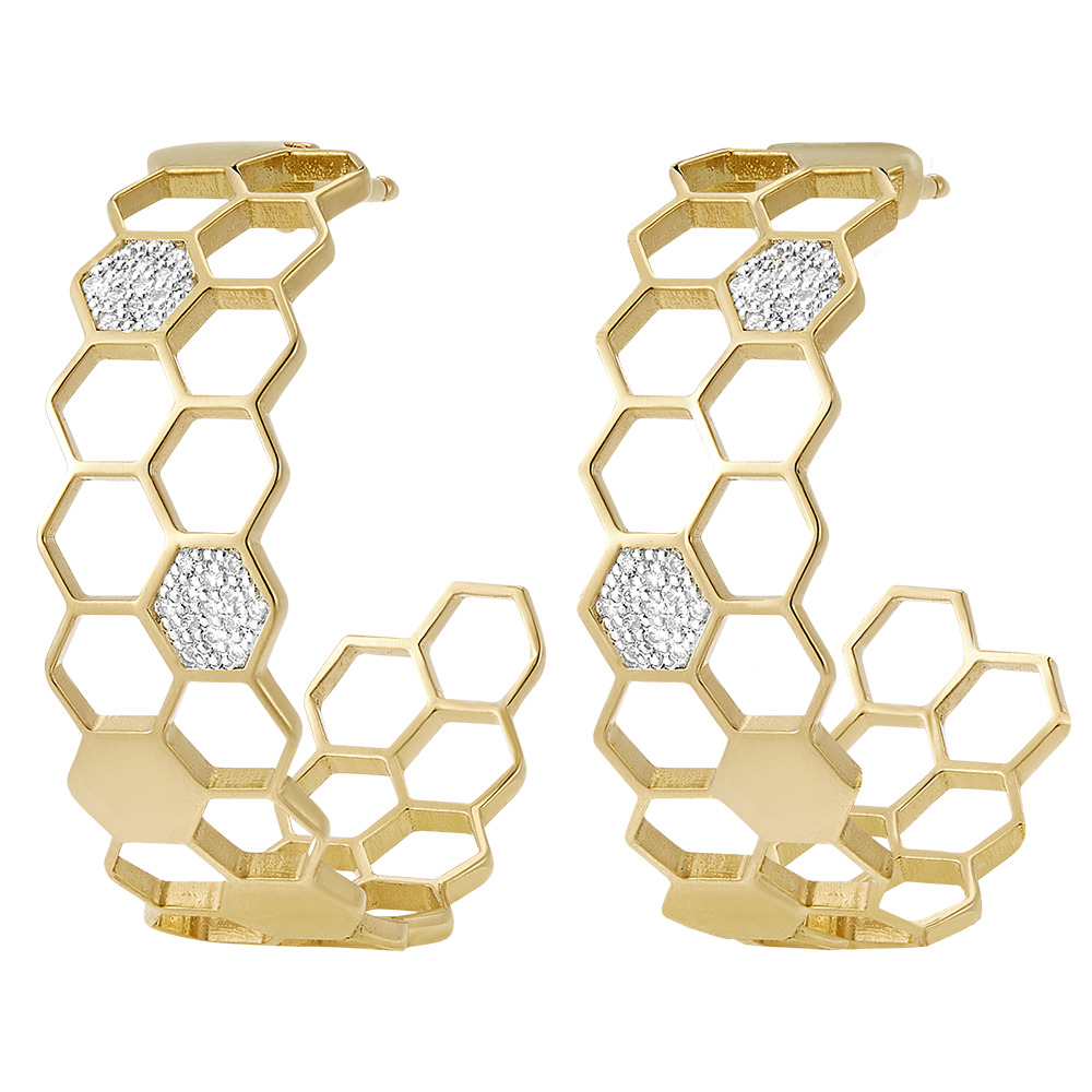 Déjese seducir por la generosa belleza de los Pendientes de Aro Revelación.Inspirada en el minucioso trabajo de las abejas, cada pendiente de aro está compuesta por dos filas de celdillas de oro finamente trabajadas, adornadas con 7 celdillas de oro macizo y 2 celdillas delicadamente engastadas con 26 deslumbrantes diamantes. Una joya excepcional, que combina elegancia y poesía, y que realzará su atuendo en cualquier ocasión.