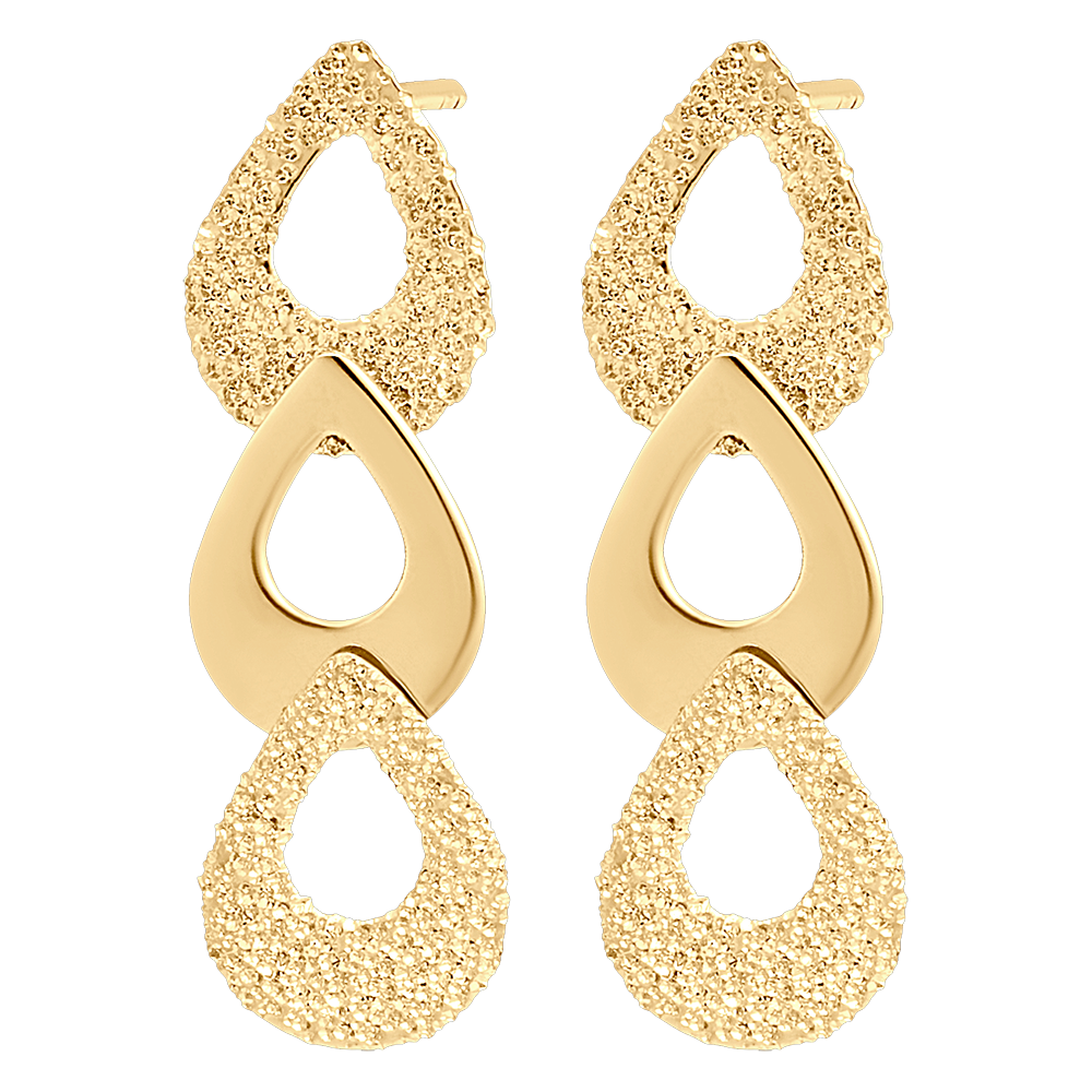 Un par de pendientes de botón en oro amarillo decididamente modernos. Adornados con 3 peras ensambladas, dos texturizadas - efecto diamante - y una pulida. Flechazo asegurado.…