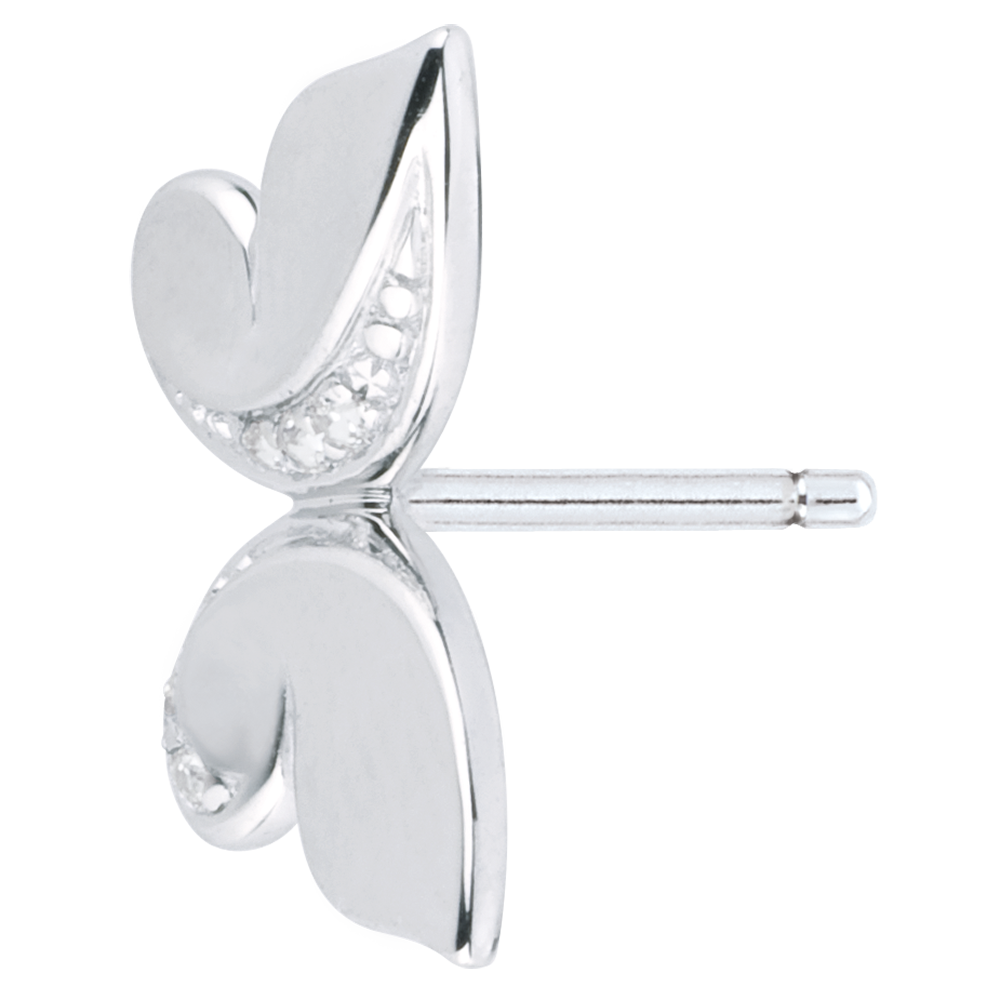 Dos gráciles mariposas de oro blanco y diamantes se posan a la par sobre los lóbulos de sus orejas.