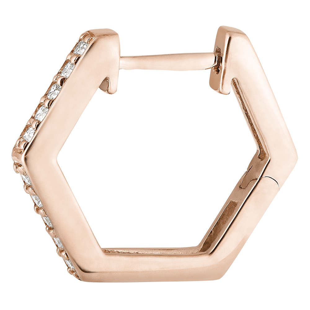 Un par de criollas hexagonales de oro rosa engastadas con delicados diamantes para un efecto gráfico y moderno. Una joya con una fuerte personalidad.