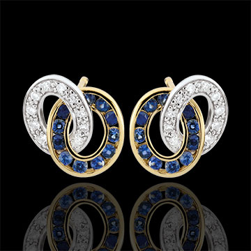 Un círculo de oro blanco y diamantes unidos para toda la vida. Un círculo de zafiros y oro amarillo.