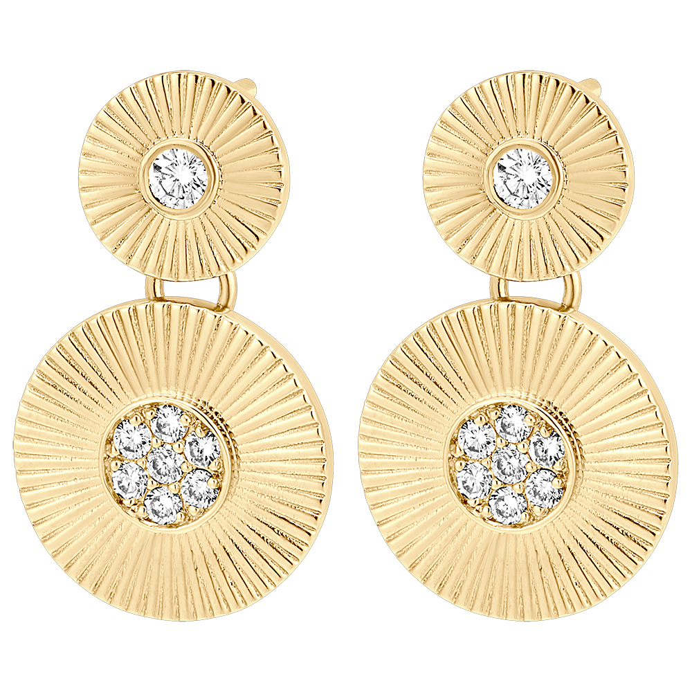 Un par de pendientes colgantes de oro amarillo, que evocan al sol con su diseño radiante e iluminados en el centro por un cúmulo de diamantes engastados. Una interpretación moderna de la opulencia, perfecta para irradiar luz en cualquier atuendo diario.