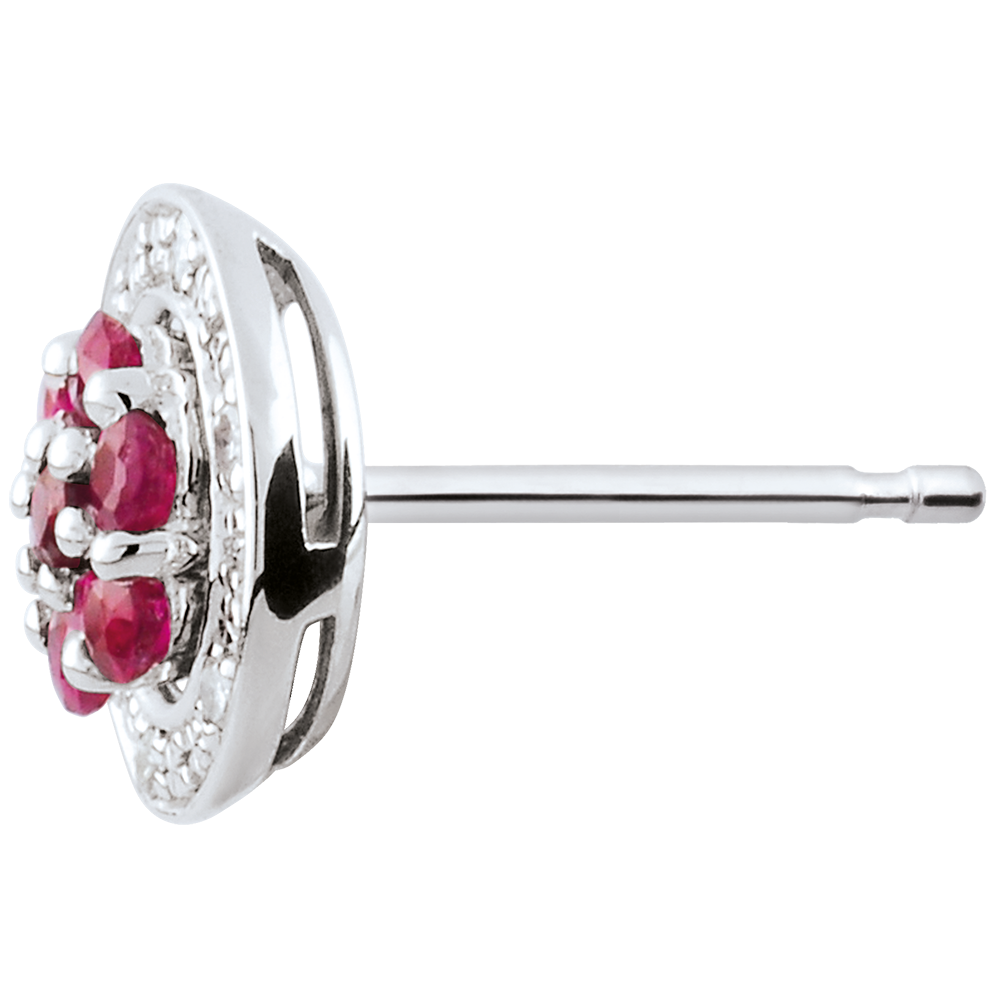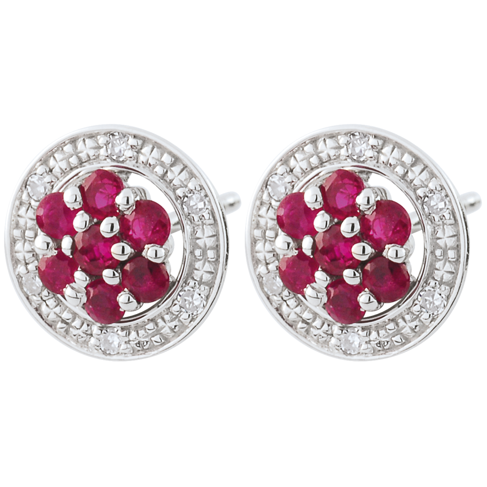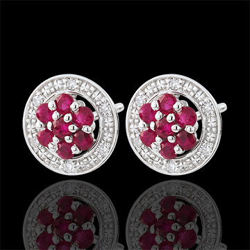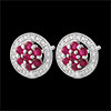Un conjunto de rubíes rodeados de un círculo de oro incrustados de diamantes.