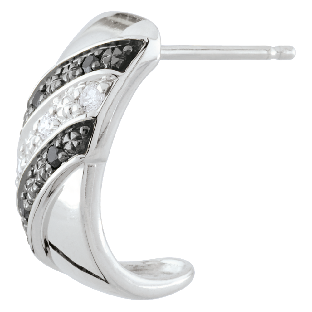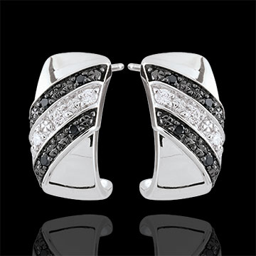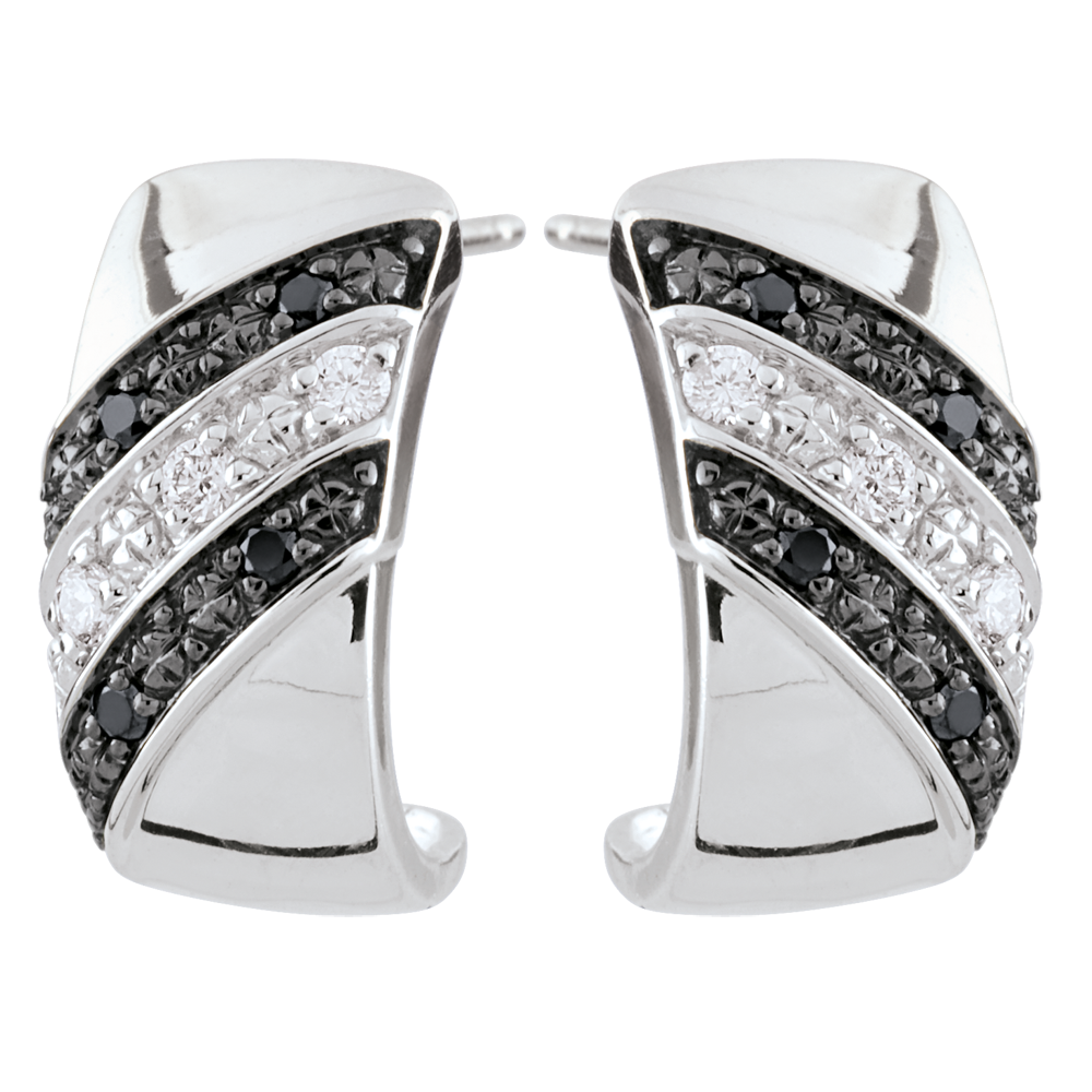 Una banda de oro brillante engalanada con un pavé de líneas de diamantes negros y blancos para dar un toque femenino y moderno a este par de pendientes.