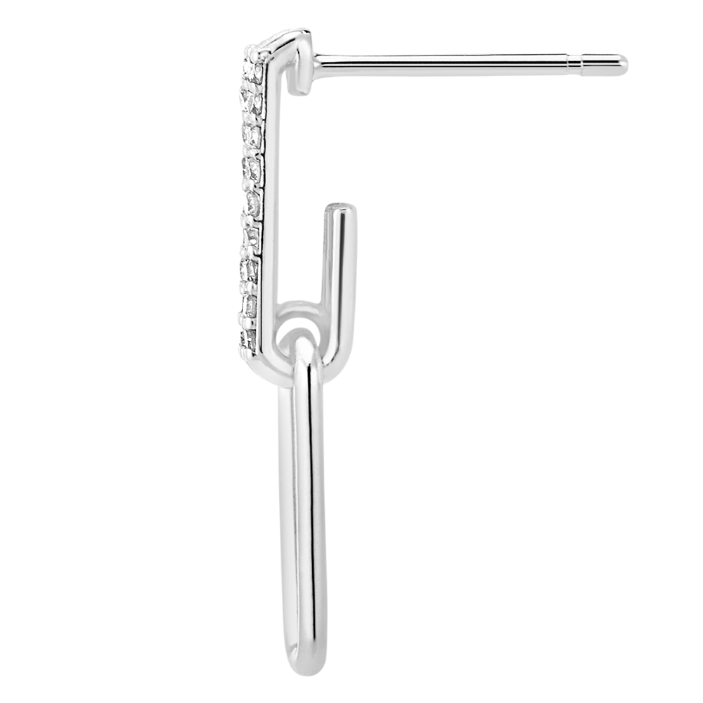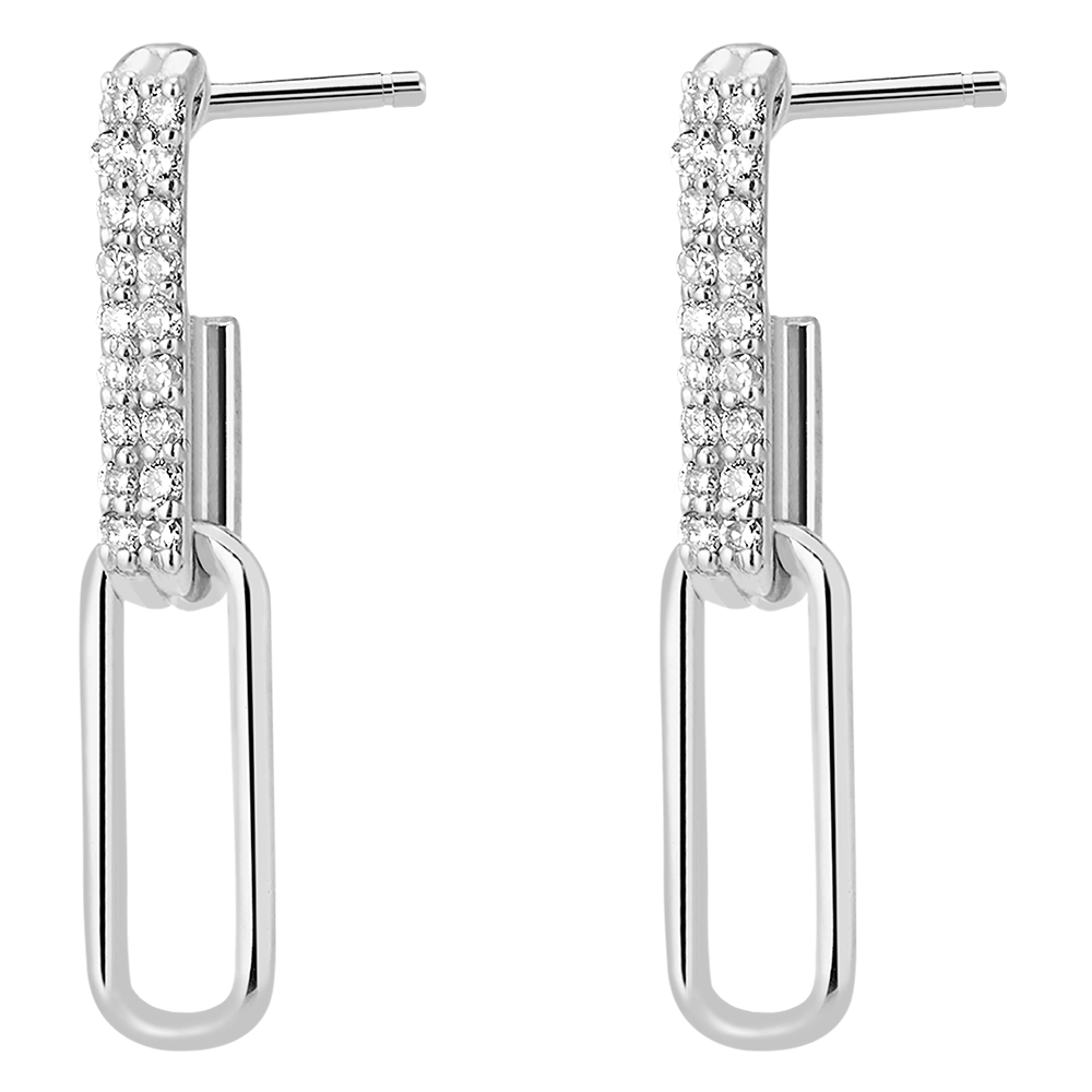 Dúo de argollas de oro blanco con un delicado decorado de diamantes, que se balancea al ritmo de sus movimientos. Un par de pendientes modernos y refinados.