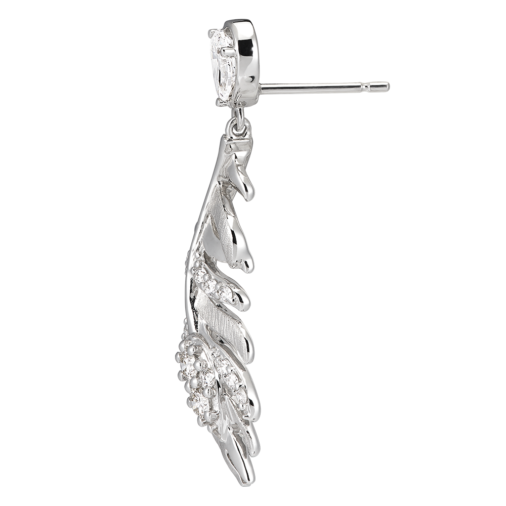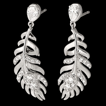 "Los pendientes Infante en oro blanco de 18 quilates se inspiran elegantemente en las plumas flotantes, símbolo distintivo de la colección Panache. Decorados con 34 diamantes sintéticos, incluyendo 2 en forma de pera de 0,25 quilates, estos pendientes capturan la luz con cada movimiento, aportando una sofisticada elegancia aérea y un resplandor espectacular a tu atuendo. "