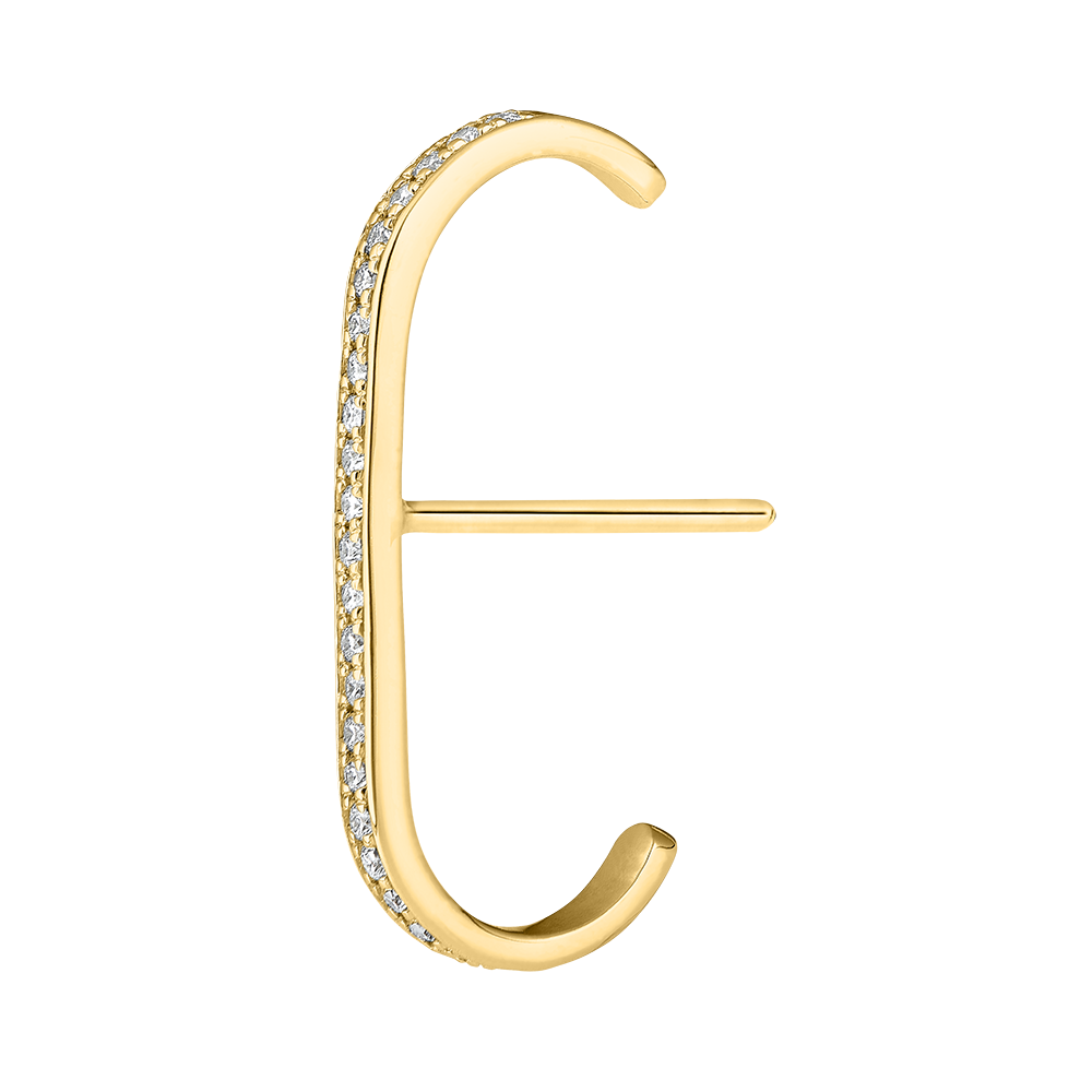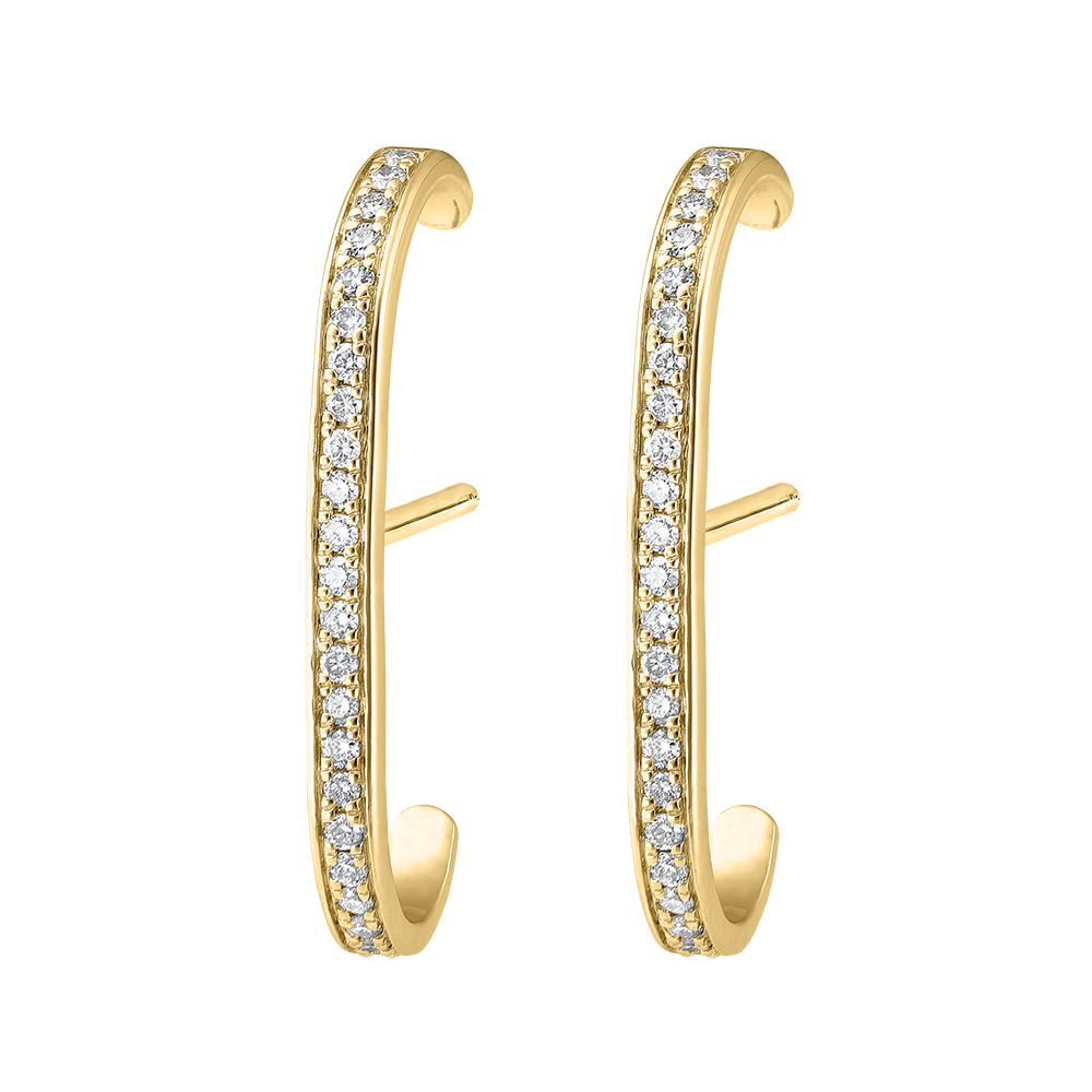 Pulgas de oro amarillo cubiertas con diamantes se alargan sobre las orejas como un relámpago centelleante.
