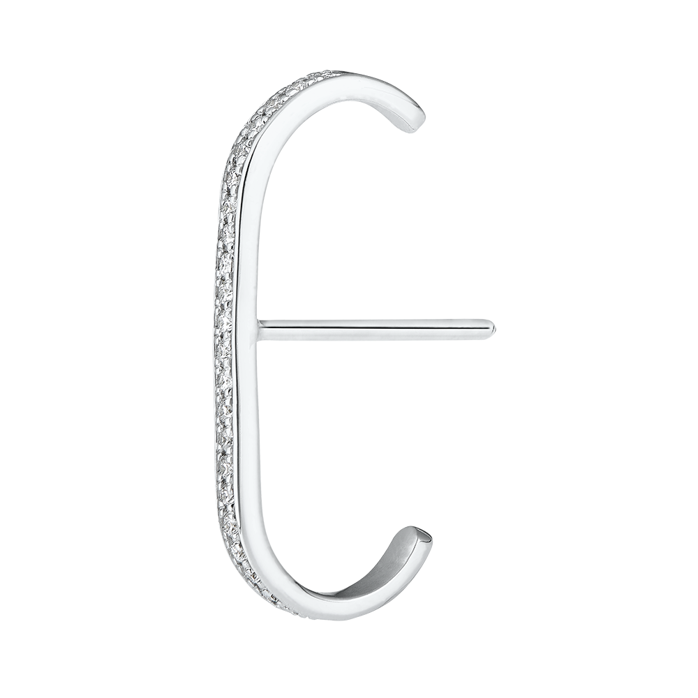Pulgas de oro blanco cubiertas con diamantes se alargan sobre las orejas como un relámpago centelleante.
