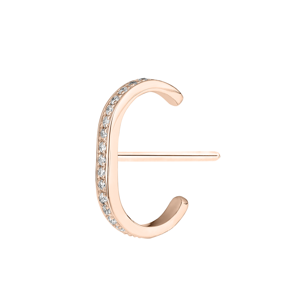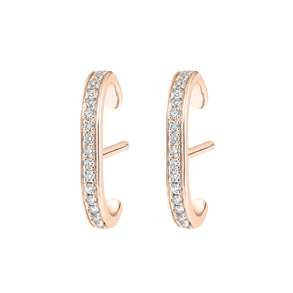 Pulgas de oro rosa cubiertas con diamantes se alargan sobre las orejas como un relámpago centelleante.