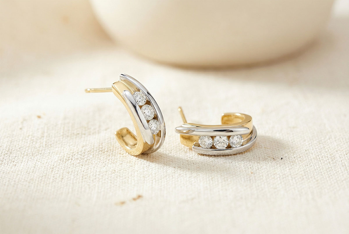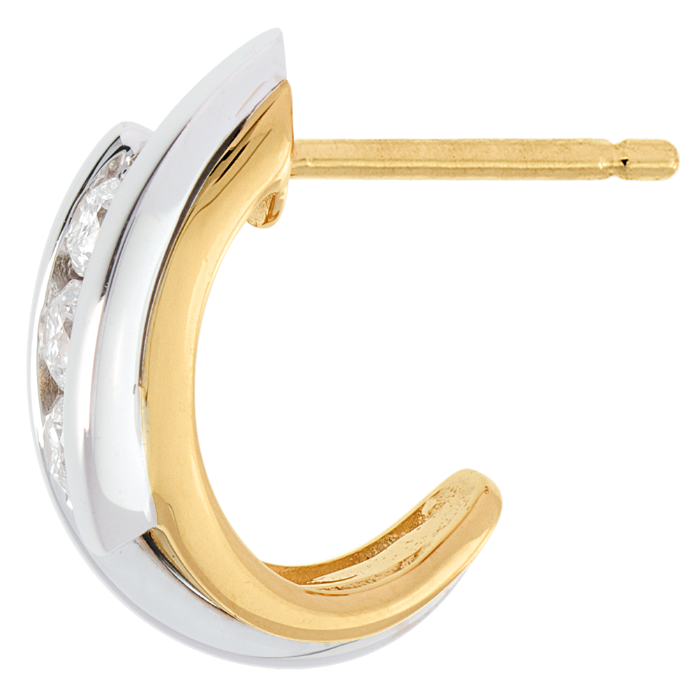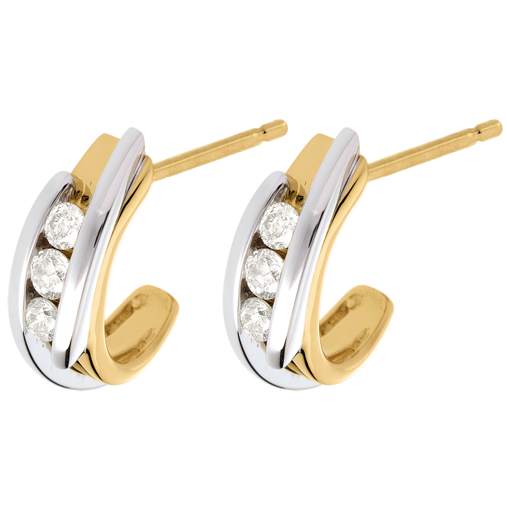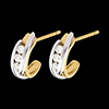 Un par de medias lunas asociada con la fuerza de una aleación de oro amarillo - oro blanco, para subrayar con delicadeza una trilogía diamantes.