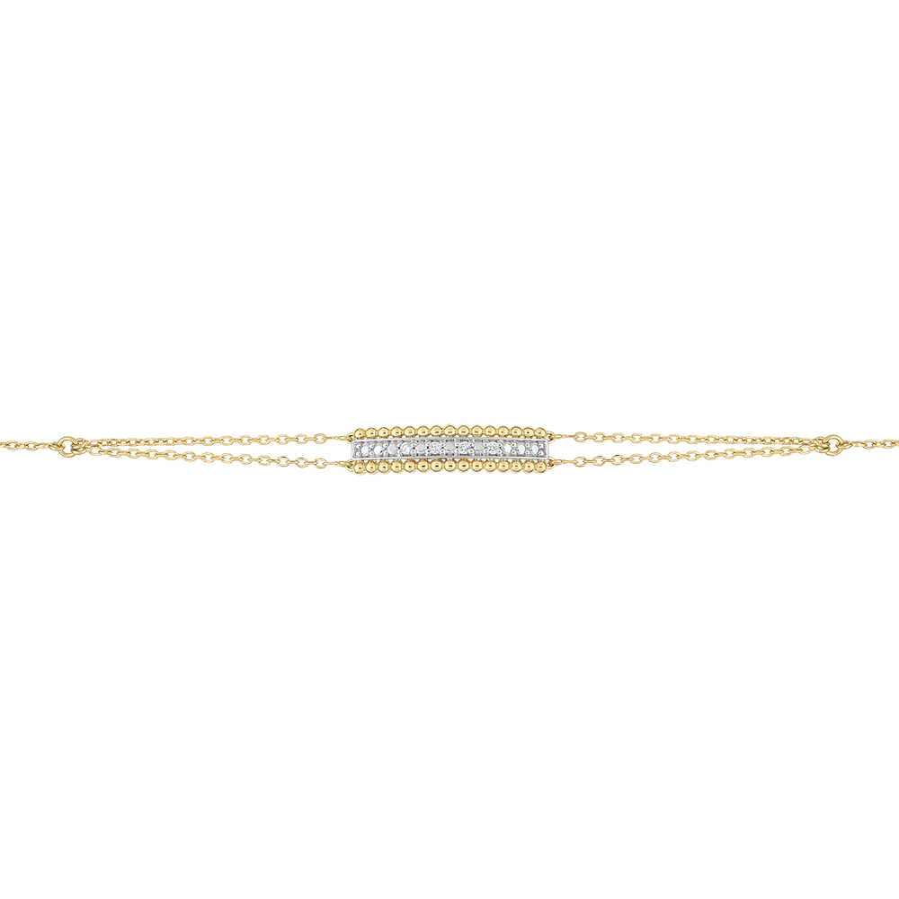 Dos hileras de perlas de oro amarillo enmarcan un pavimento de oro y diamantes elevado. El motivo es realzado por dos cadenitas que se unen para formar una única cadena. Pulsera de longitud ajustable: 18 cm, 17 cm, 16 cm. Motivo de 21 mm de largo y 5 mm de alto.