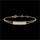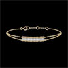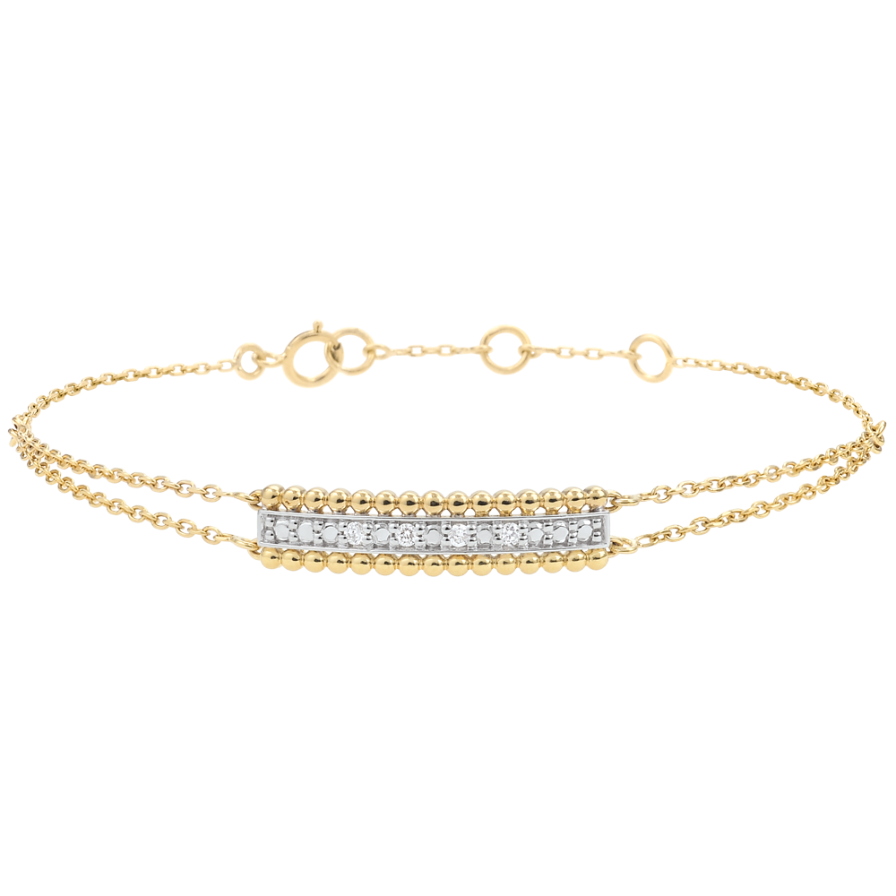 Dos hileras de perlas de oro amarillo enmarcan un pavimento de oro y diamantes elevado. El motivo es realzado por dos cadenitas que se unen para formar una única cadena. Pulsera de longitud ajustable: 18 cm, 17 cm, 16 cm. Motivo de 21 mm de largo y 5 mm de alto.