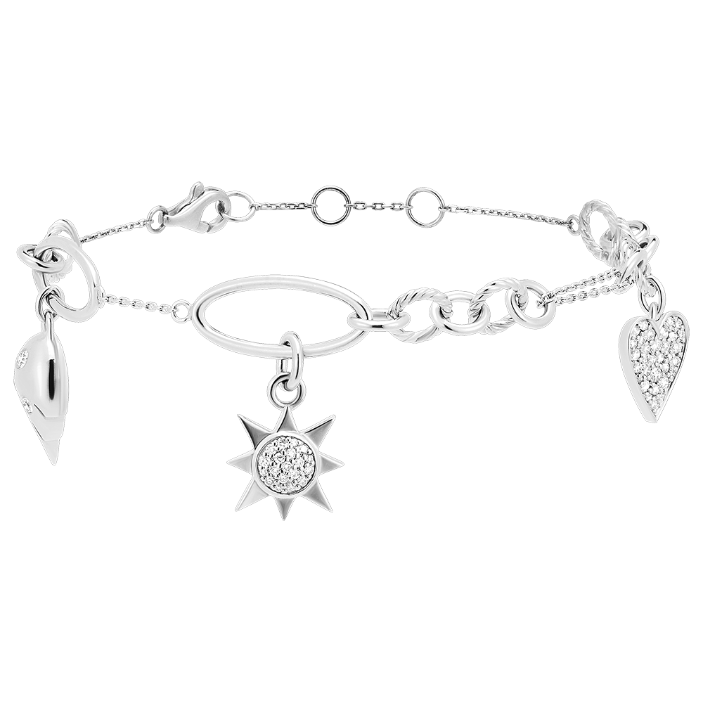 - Diseño talismán único con colgantes corazón, sol y ala