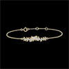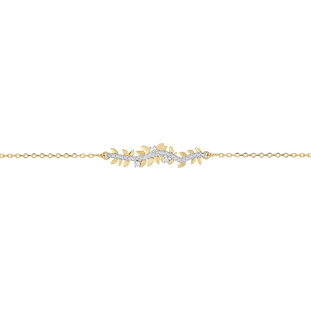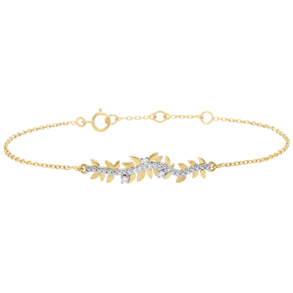 Hojas de oro amarillo con diamantes se alternan con hojas de oro rugoso, frotado a mano, para crear una pulsera romántica salpicada con 7 diamantes cuales gotas de rocío que realzan el brillo natural de esta preciosa pieza única. Pulsera de longitud ajustable: 18 cm, 17 cm, 16 cm. Motivo de 30 mm de largo y 5 mm de alto.