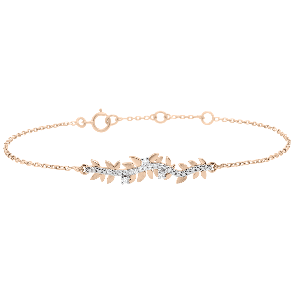 Hojas de oro rosa brillantes y hojas de oro de acabado rugoso hechas a mano se alternan para crear una pulsera romántica con 7 diamantes. Pulsera de longitud ajustable: 18 cm, 17 cm, 16 cm. Motivo de 30 mm de largo y 5 mm de alto.