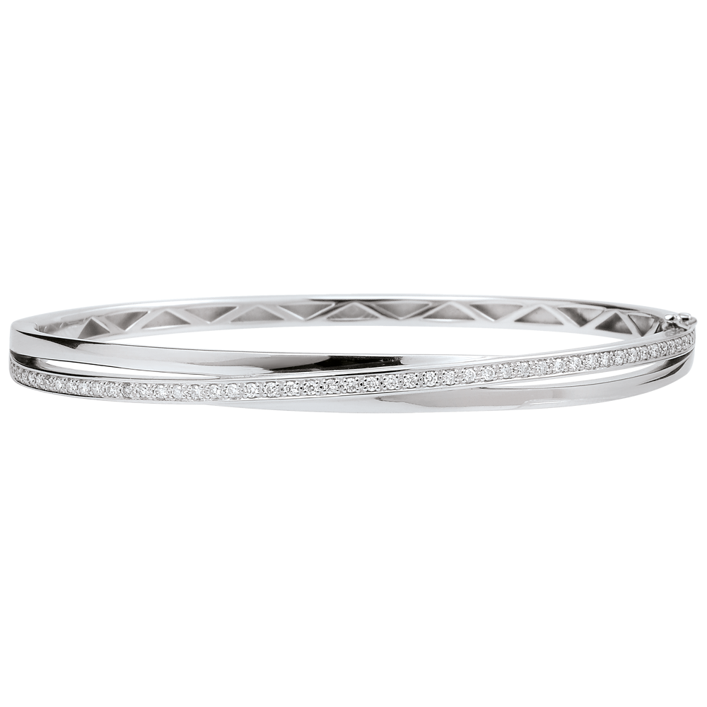 Una unión en equilibrio de tres anillos de oro sublimada con un empedrado de diamantes sobre oro blanco obtiene como resultado esta preciosa y sofisticada pulsera.