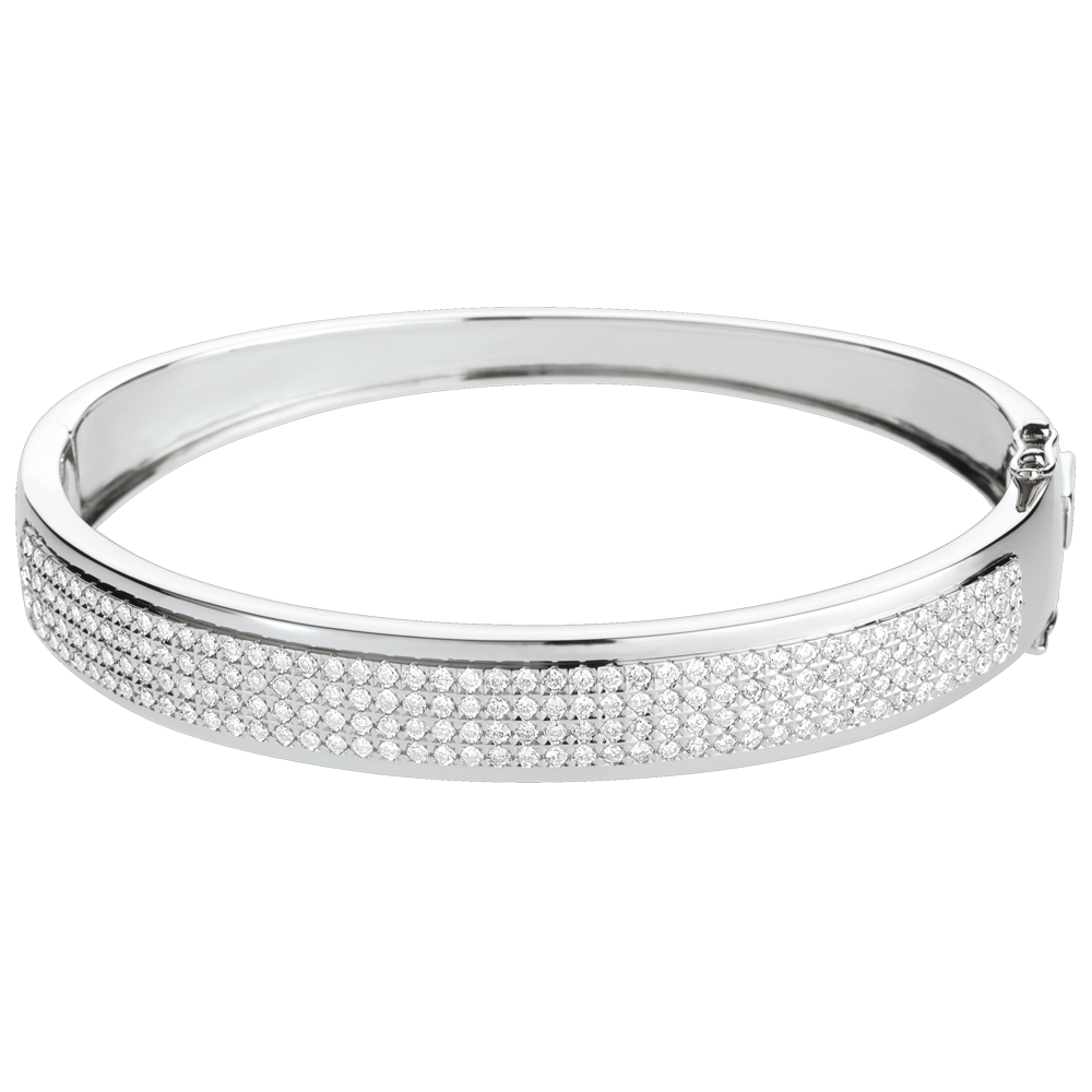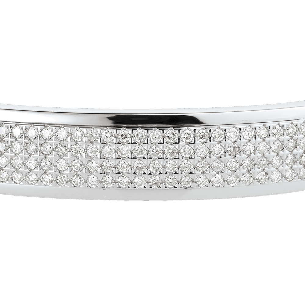 Un pavimento sobre oro blanco de 4 hileras de diamantes perfecto para vestir su brazo con una elegancia clásica a la par que sobria.