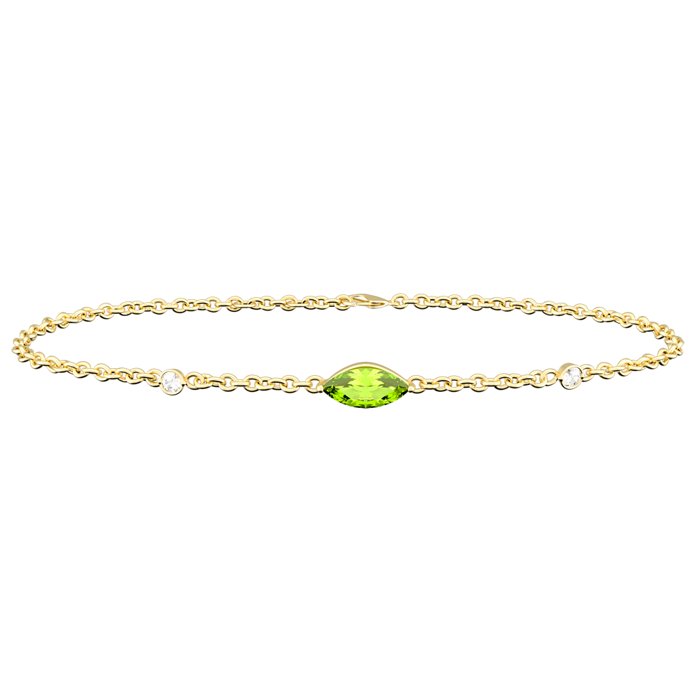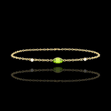 La preciosa pupila simbolizada por un peridoto de corte marquesa coronado en el centro de esta fina cadena de oro amarillo. Está rodeado por dos diamantes magníficos como dos lágrimas congeladas para siempre.