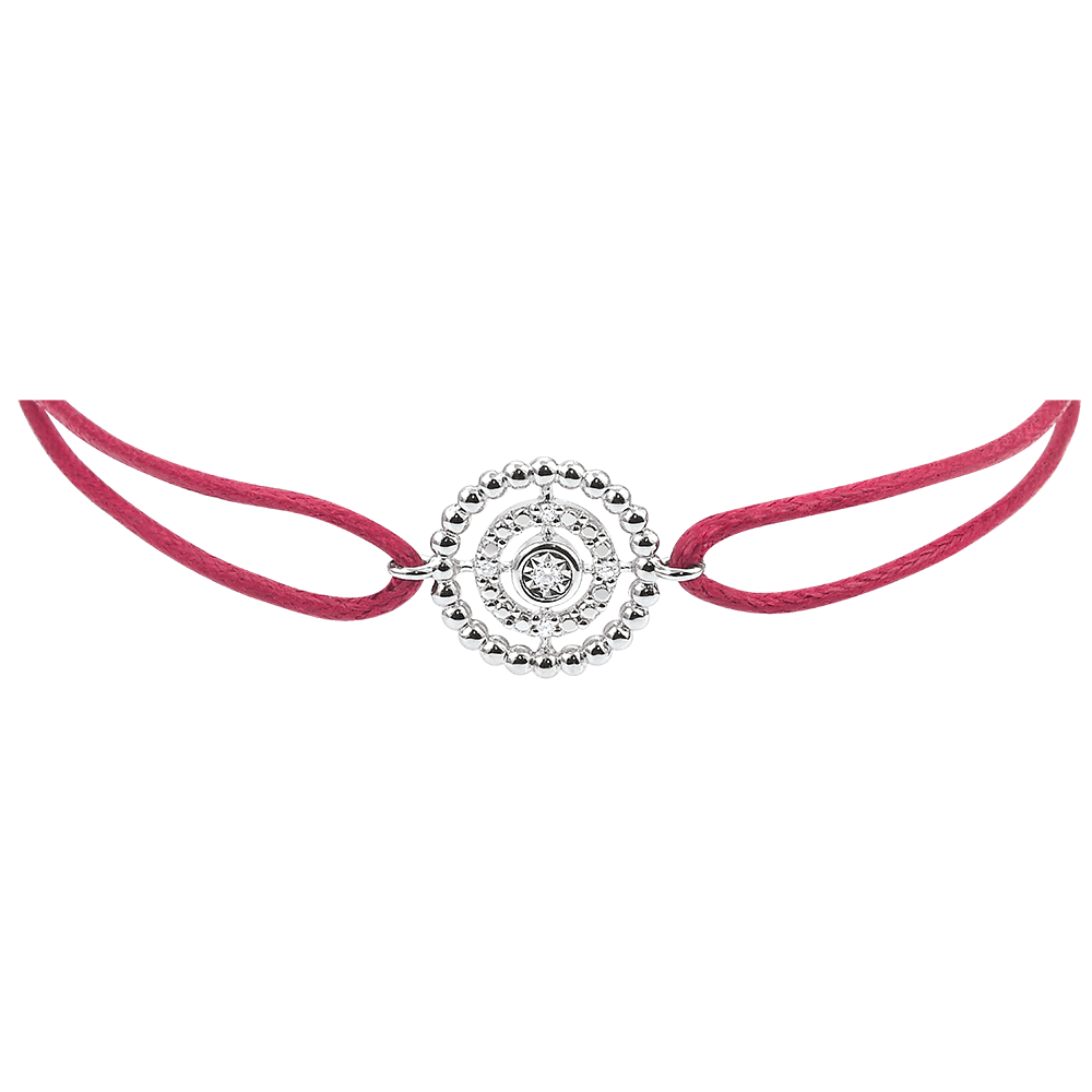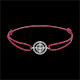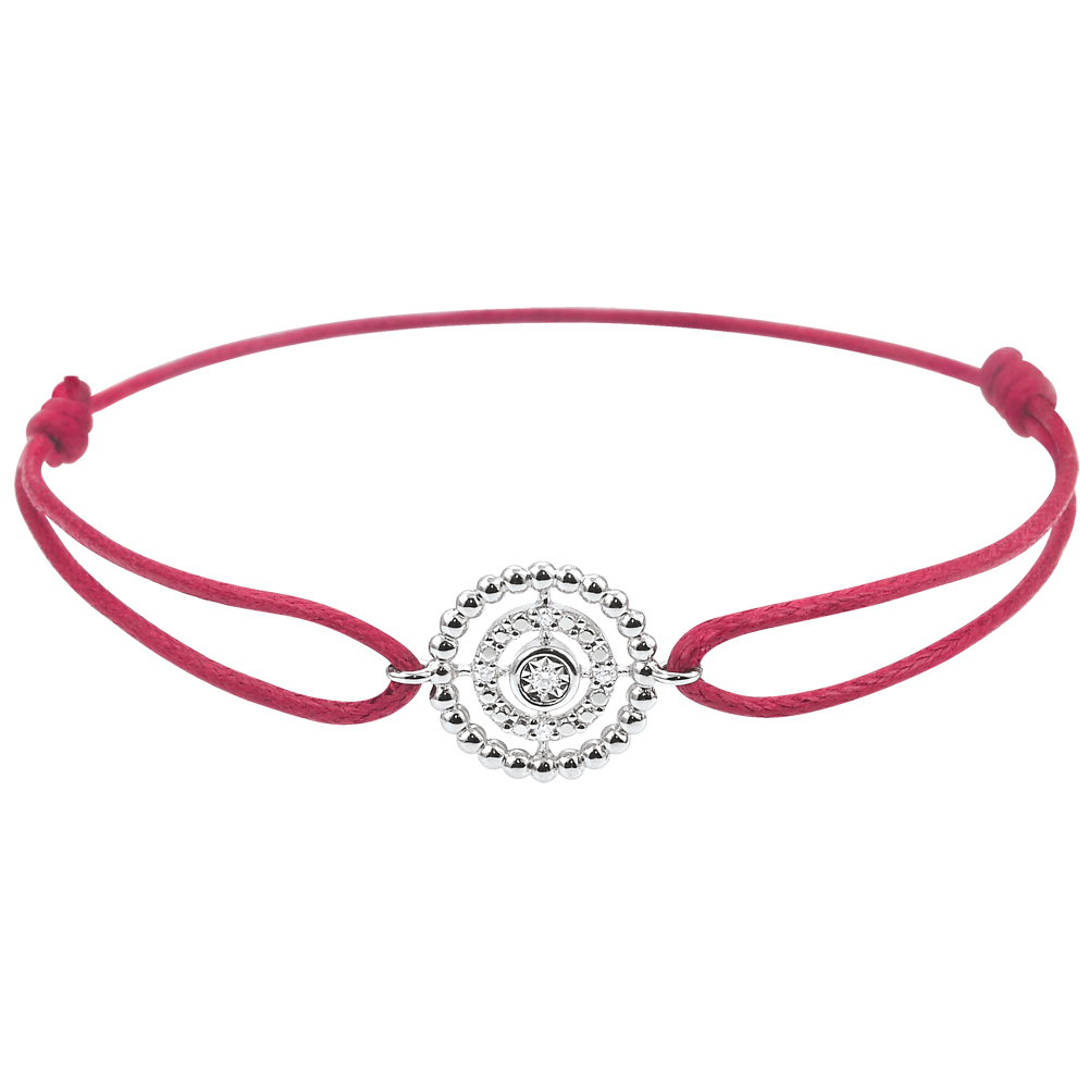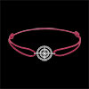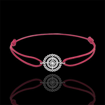 Un circulo de perlas de oro enmarcados por un circulo de diamantes y un solitario en su centro. El motivo esta montado sobre un cordón moderno de color rojo.