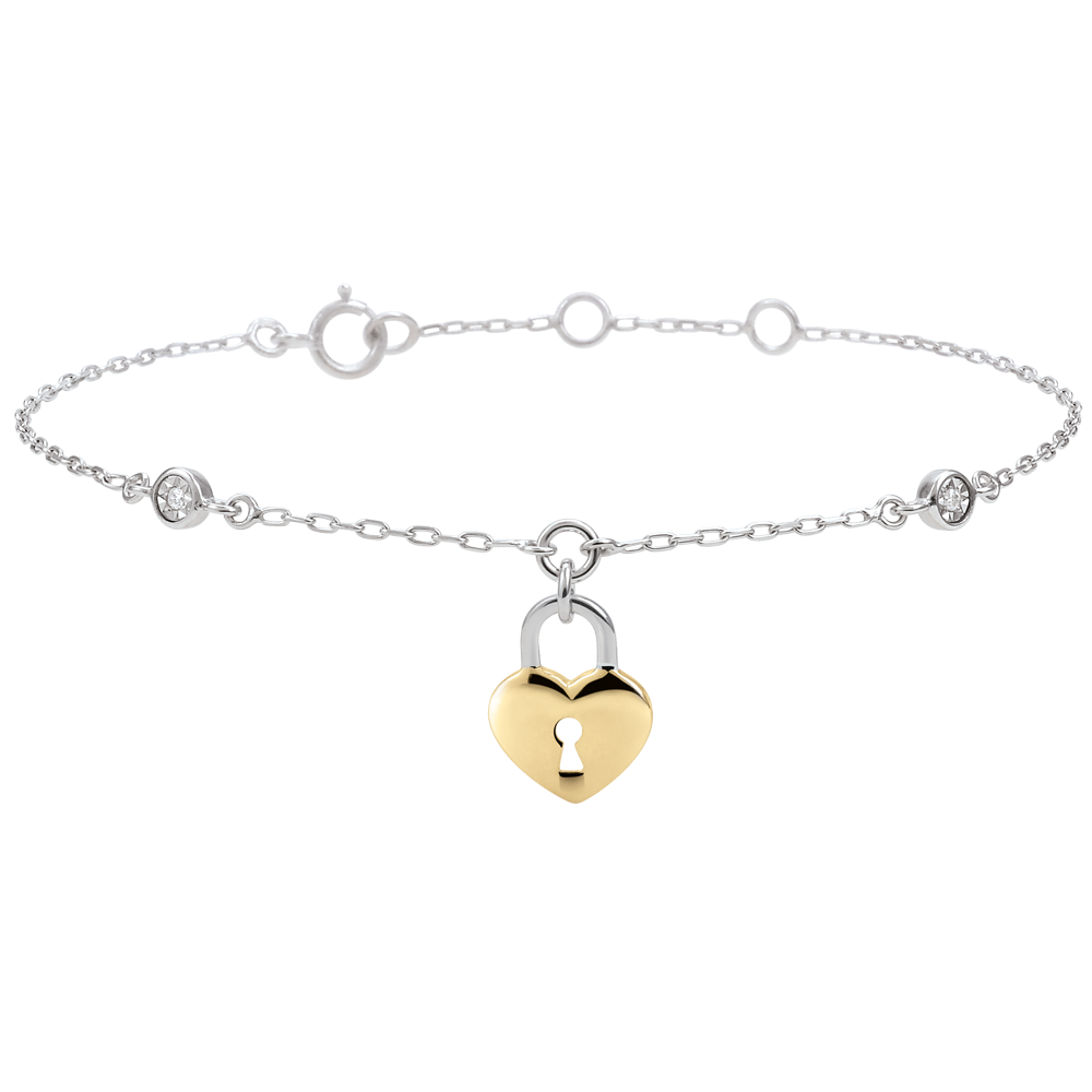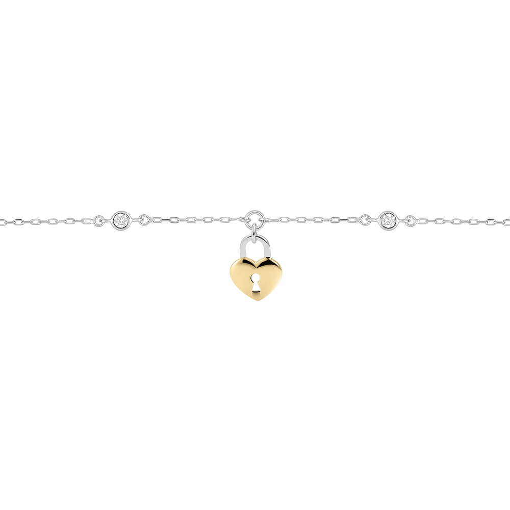 Un corazón de oro amarillo, portador de una cerradura en su centro, está montado sobre una cadenita de oro blanco adornada con dos diamantes brillantes. Pulsera de longitud ajustable: 18 cm, 17 cm, 16 cm. Motivo de 8 mm de largo y 11 mm de alto.