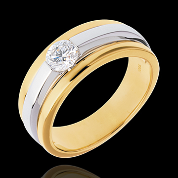 La fusión de la semi-luna y del anillo, coronada de un diamante, y subrayada por la fuerza de una aleación dos tipos de oro