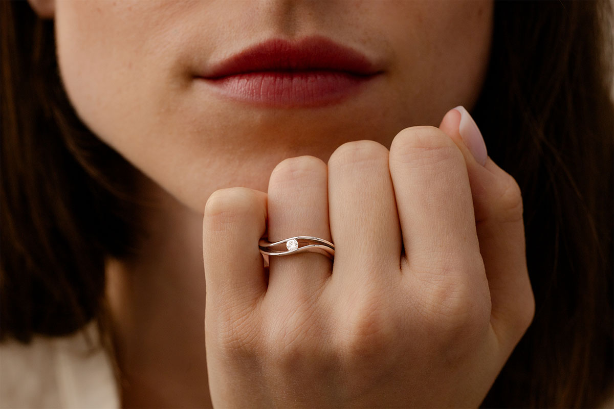 Pieza de Oro Blanco iluminada por el diamante solitario del centro.