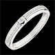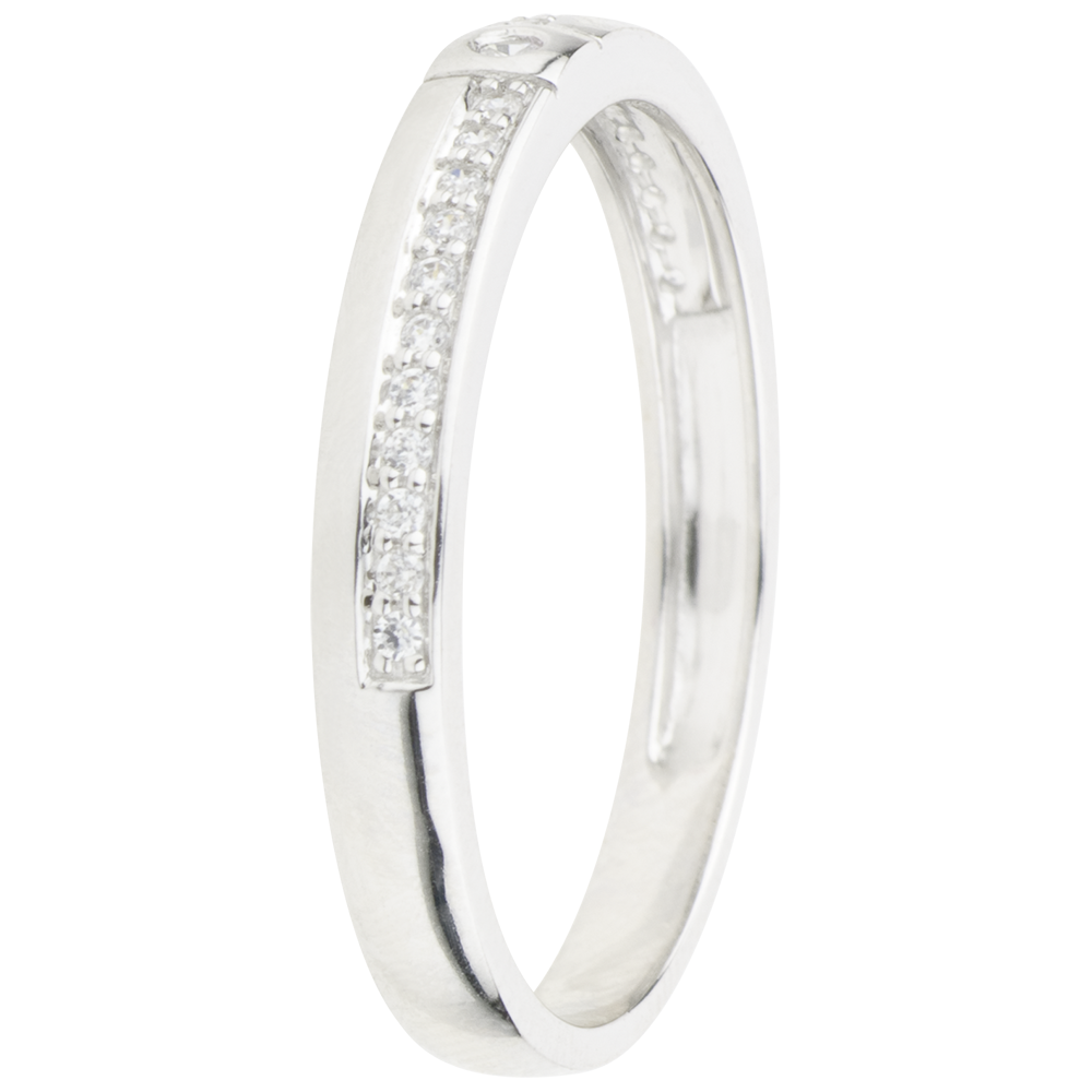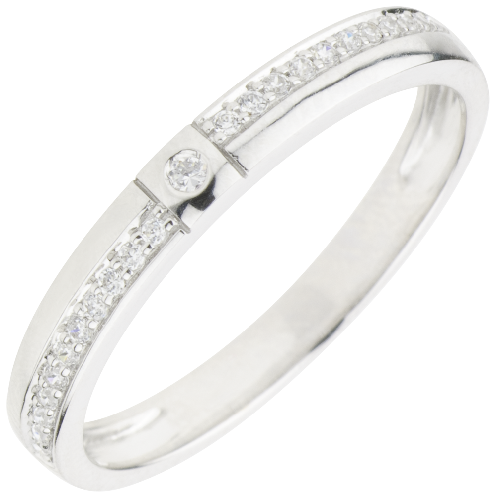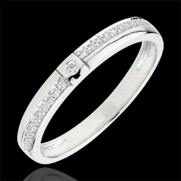 Un diamante solitario en el centro de una montura asimétrica pavimentada con diamantes para darle la elegancia de originalidad sutil.