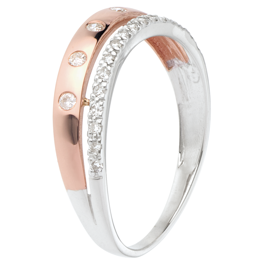 Una alianza de oro rosa salpicada de brillantes, coronado con un anillo de oro blanco pavimentado.