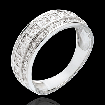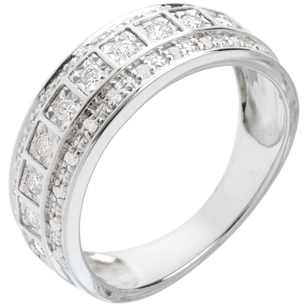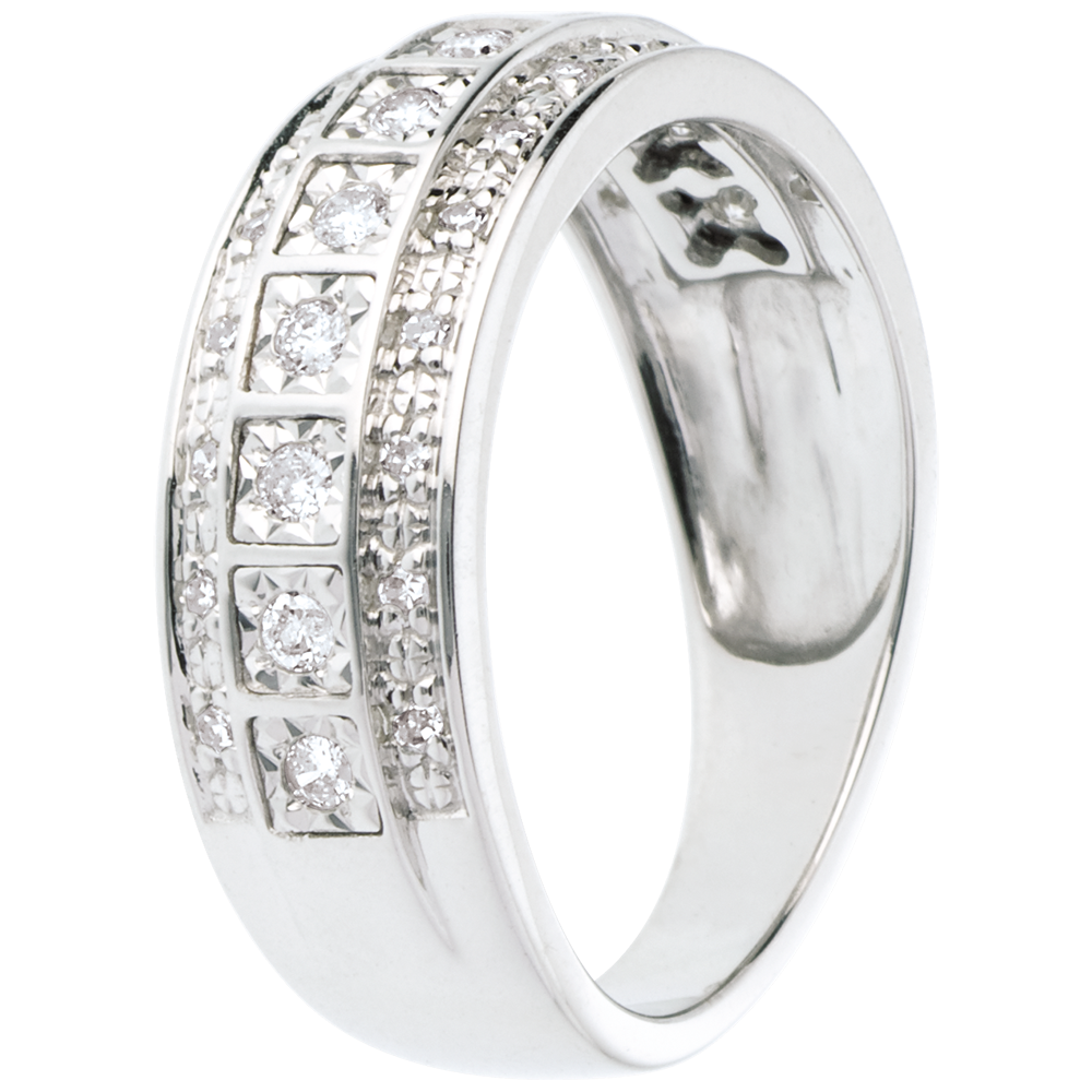 Un mosaico de 33 diamantes de brillo sin igual. Una montura sobria para un anillo resplandeciente.