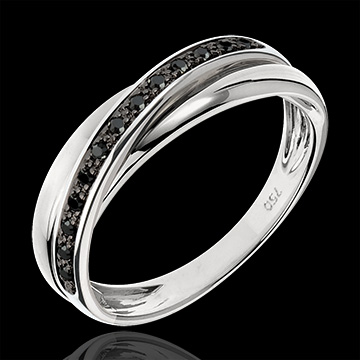 Tres aros de oro blanco se unen para formar un anillo excepcional gracias al detalle de los diamantes negros en la parte central.